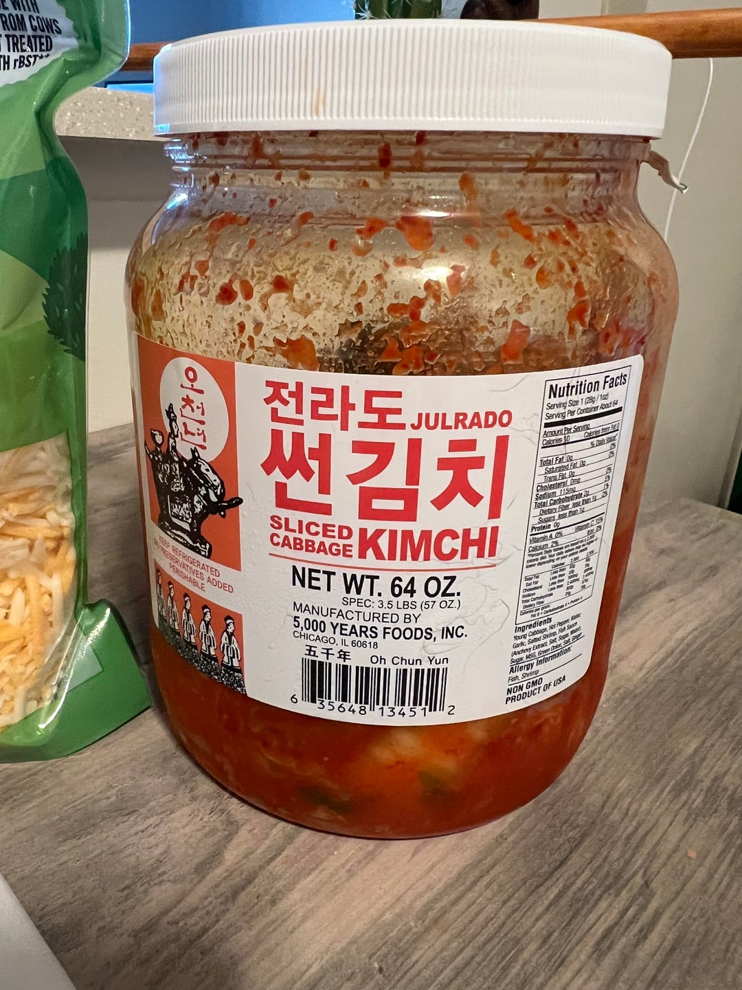 layer cheese and top with your favorite kimchi. i get mine from a local korean/asian market.