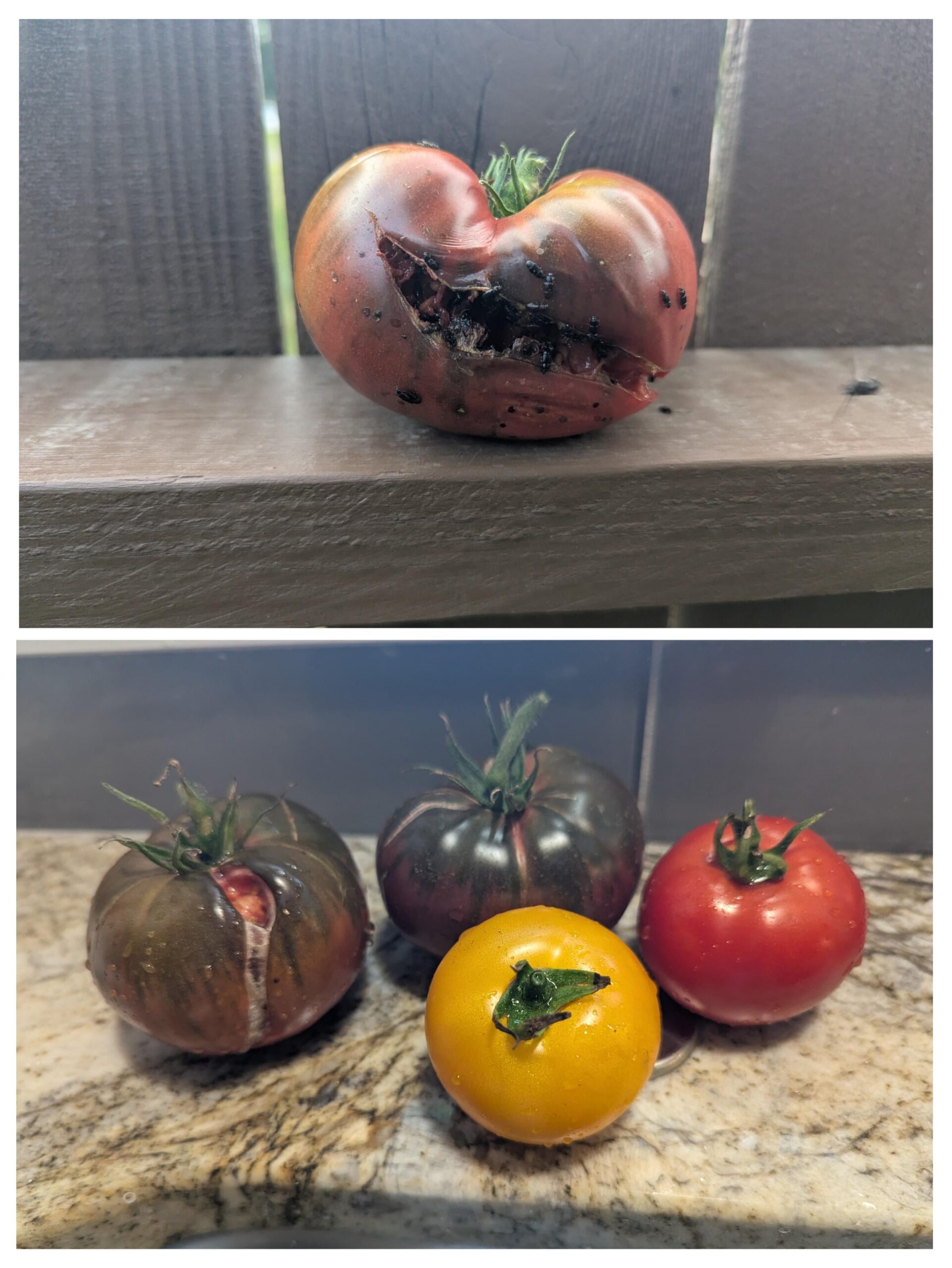 My Cherokee split this year too but I also had some Blossom rot on the bottom but I also had a bunch of chicken poop and bone meal and that fed them the calcium and others stuff works pretty good to prevent more of it showing up and I getting more Cherokee coming in normal was hot and dry then cold and wet as they where on the vine … cause the spilts to much h20