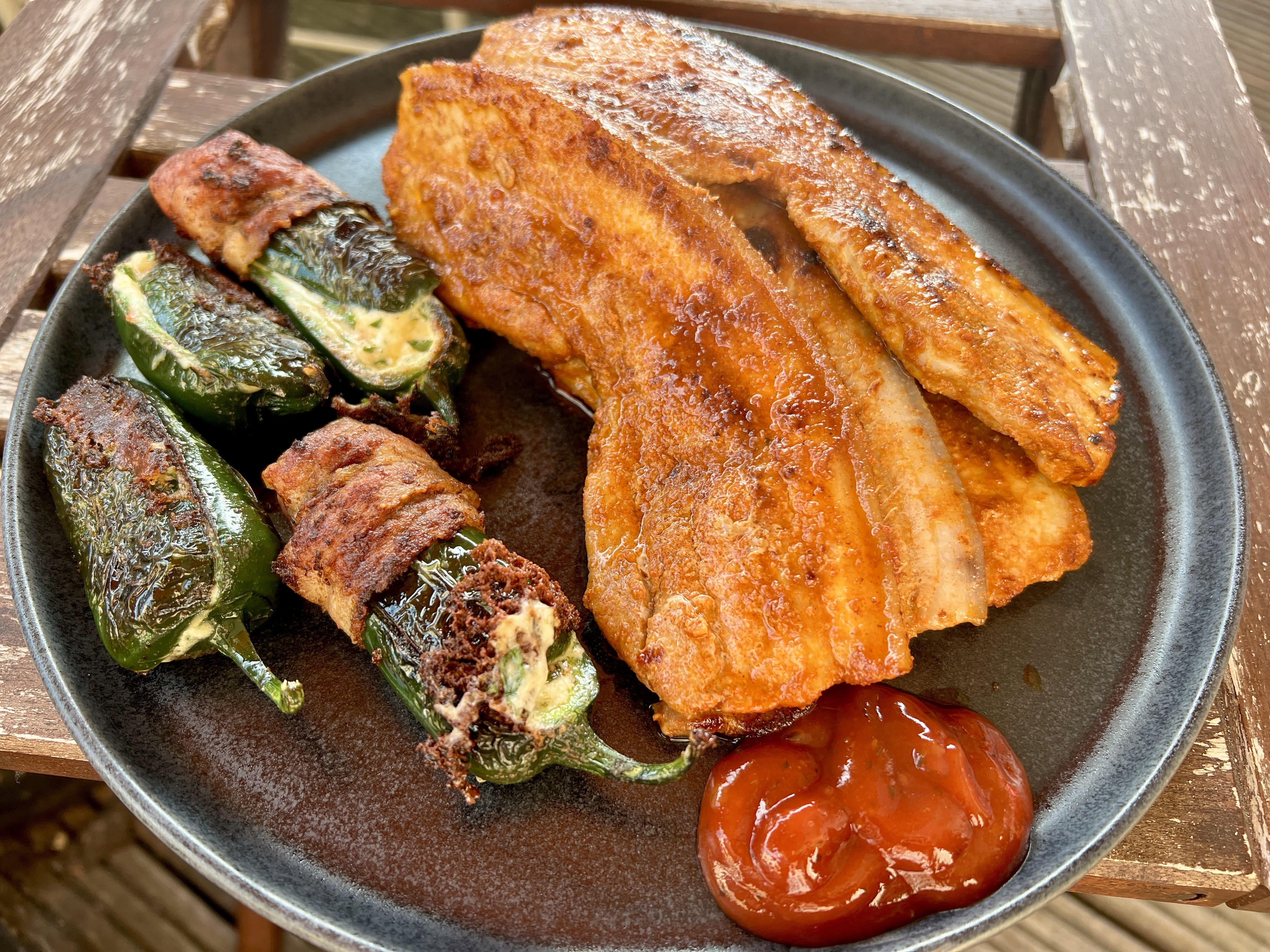 Strips of pork belky and stuffed Jalapeños. by hansebart 1 Comment PetroniusKing 3 weeks ago Your plate looks delicious what were the jalapeños stuffed with? I’m craving an ice cold Mexican beer 😊👍🤤