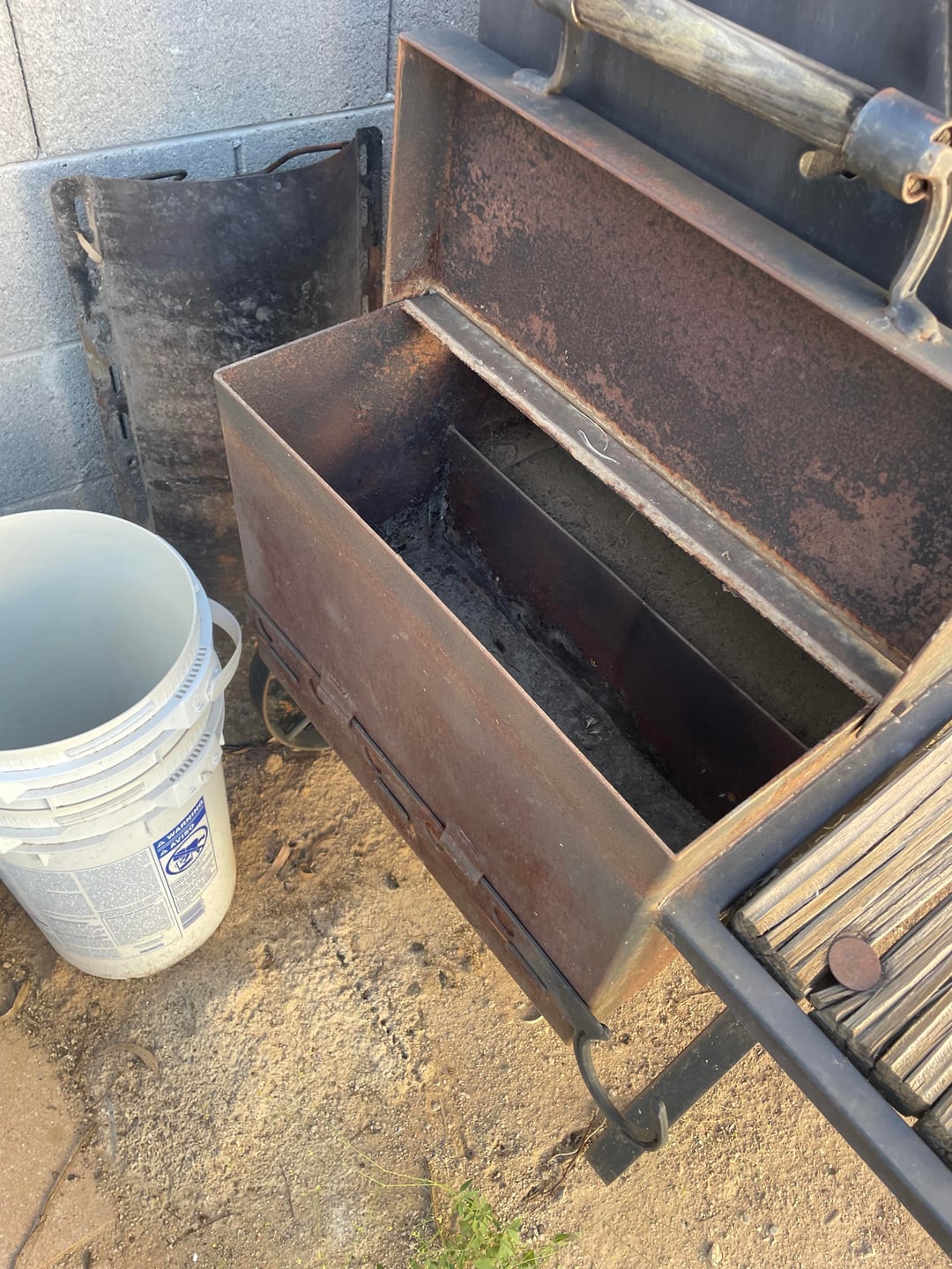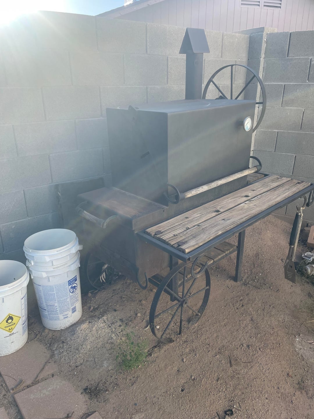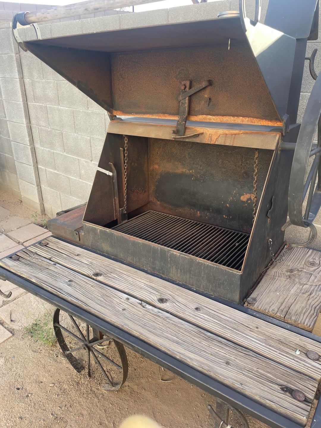This smoker was left behind when I purchased my home. It can be used as a smoker or a Santa Fe grill. The wheel on the side raises and lowers the grill grate. I would keep it but I have several cookers already (Weber Kettle, Char Griller Grand Champ XD offset, Camp Chef XXL PRO pellet smoker, and a 6 Burner Blacktop Griddle). Do you guys think it's worth restoring to possibly sell? Also, it doesn't have any brand markings, so I think it was handmade, or does anyone recognize it if it was manufactured?