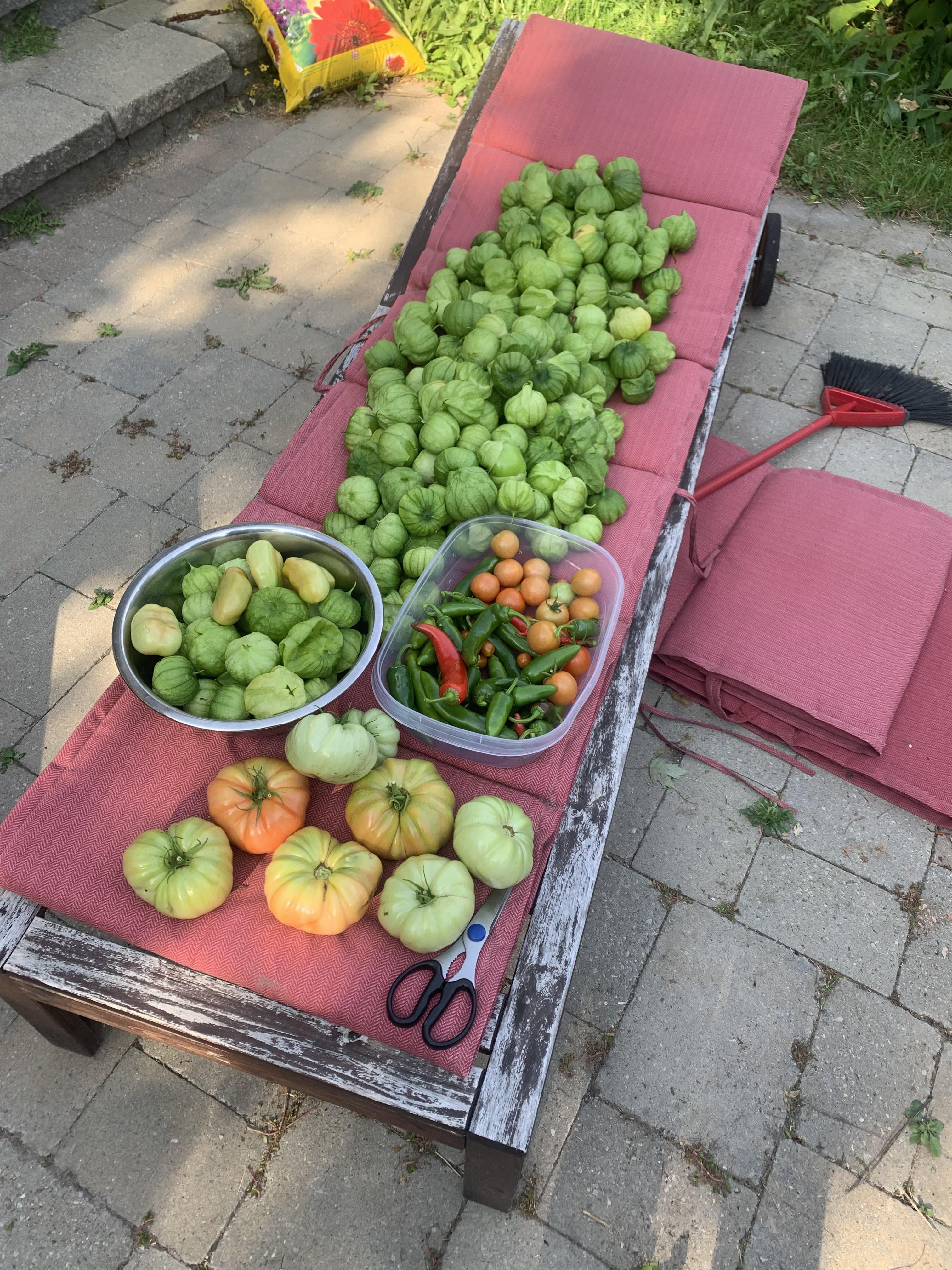 Big harvest from our tomato and pepper plants, the tomatillos alone weighed in at 40lbs. This is how much we picked in one day, probably not going to get any harvest near this size for the rest of the year but for now it is time to make and jar salsa!