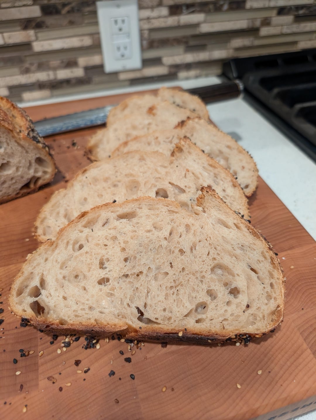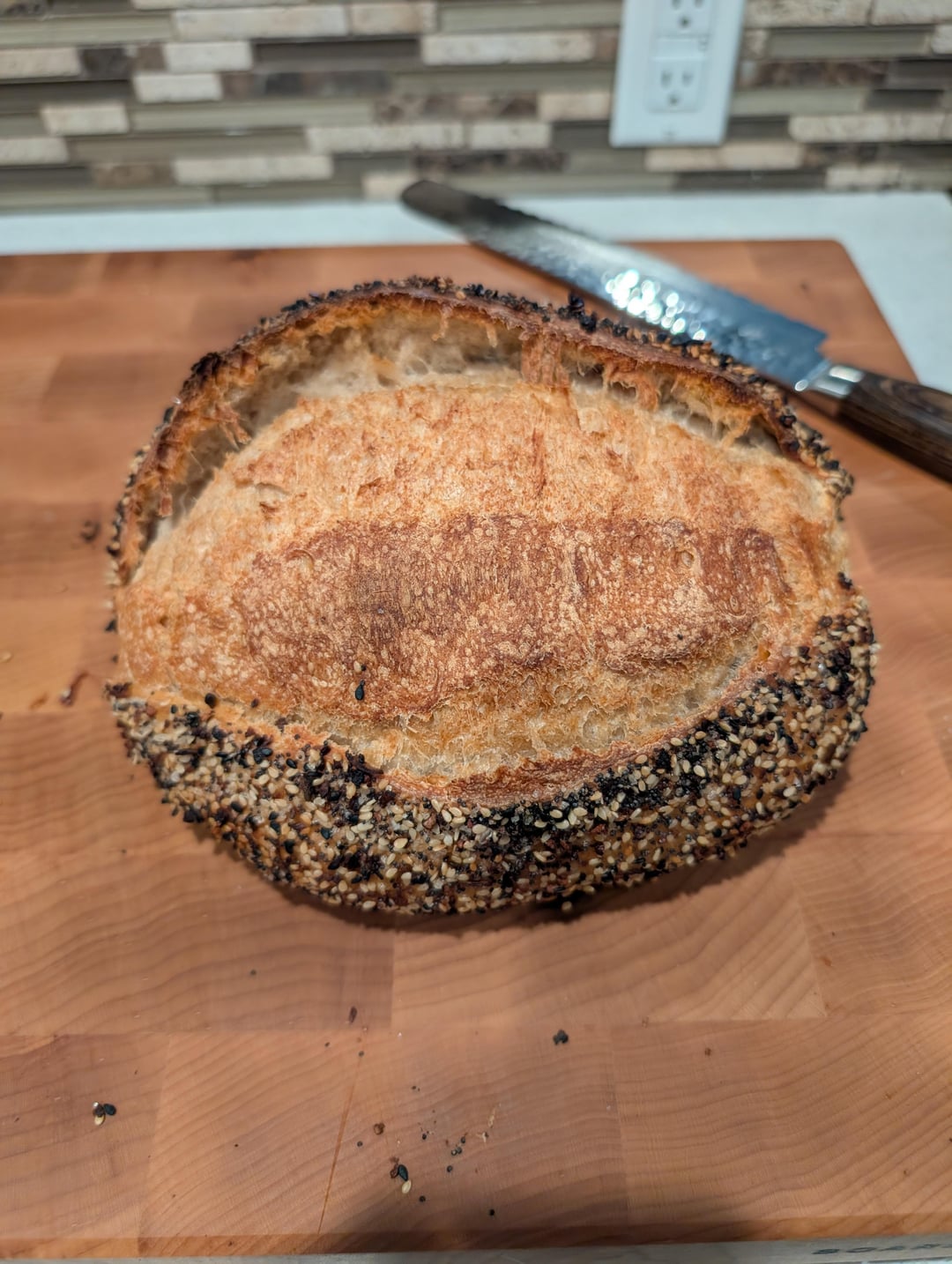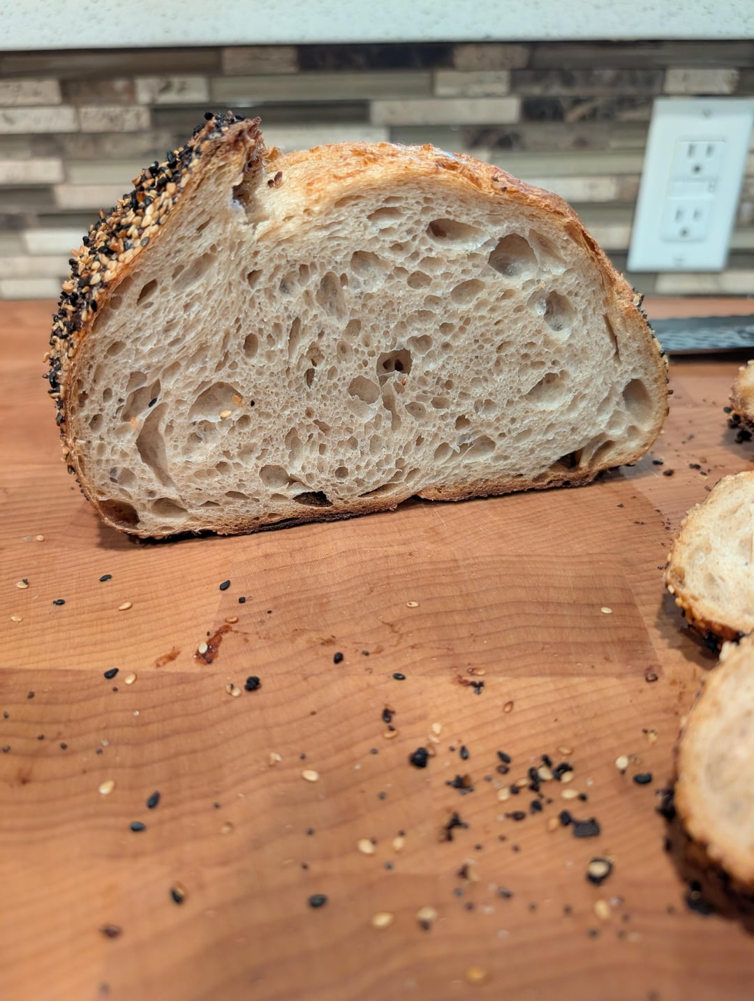 12) Flip dough onto parchment paper, spray with water (add toppings, my favorite is everything bagel seasoning), and score