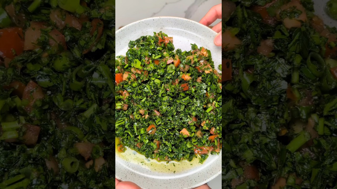 Let’s make classic tabuli. Finally, chop two bunches of curly parsley by hand. Skip the food processor. It bruises the herbs. Add in two diced tomatoes, two chopped green onions, and a few spoons of fresh mint. Squeeze in the juice of one lemon. Drizzle a/3 of a cup of olive oil. Then, season with salt and pepper. Toss it all together, and you’ve got a bright, refreshing salad that goes with everything.