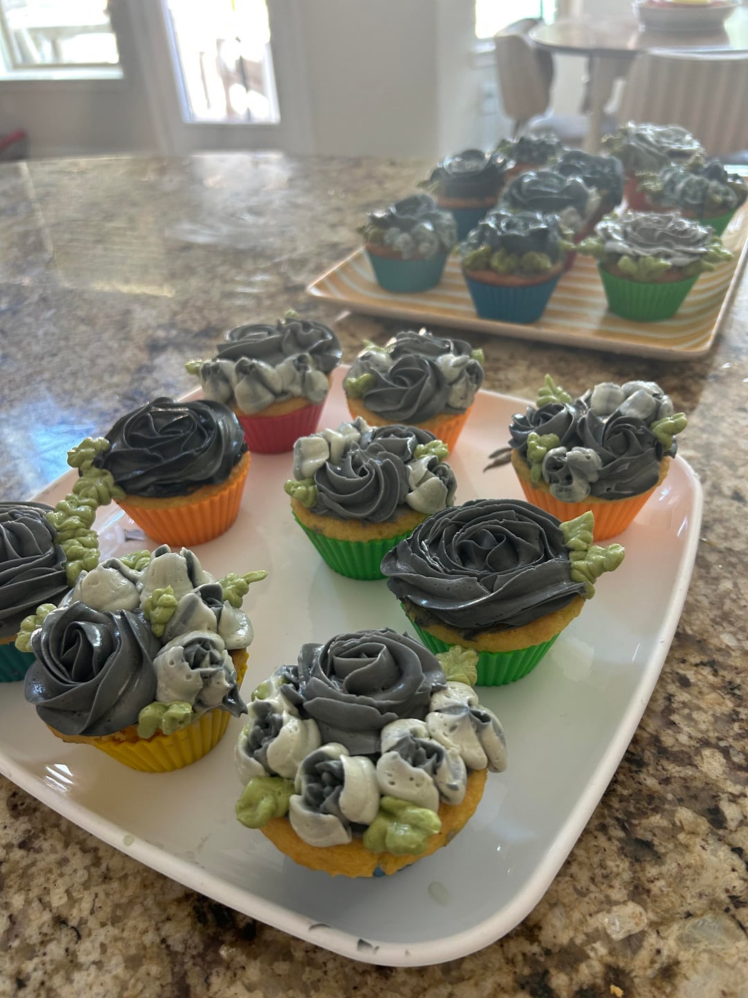 I was able to generously frost 18 cupcakes, although the last couple were a struggle. Next time I’ll do 1.5 batches and will mix more of the colors at the start with additional fridge time.