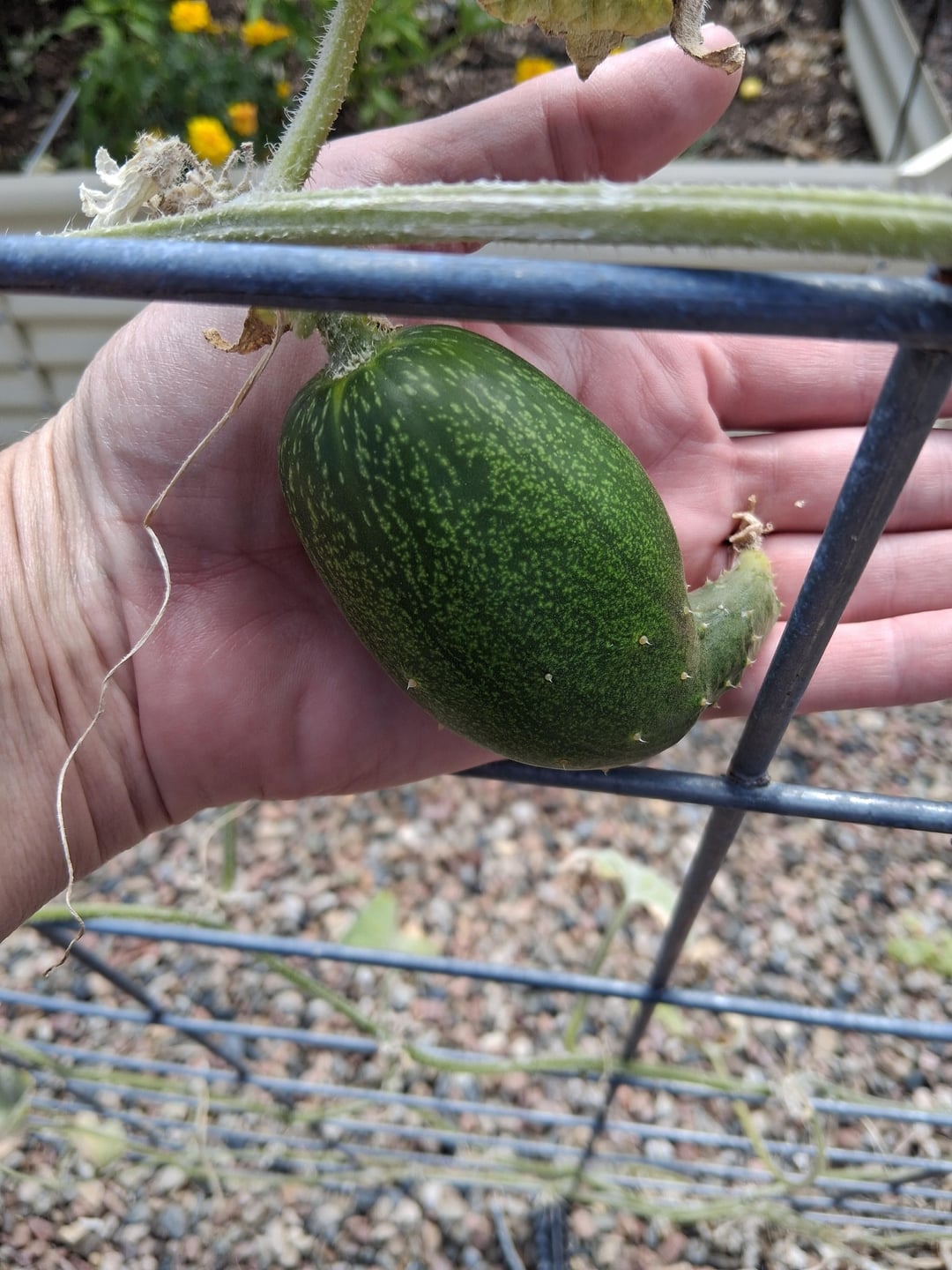 If you’re high desert, it has been getting too cold for those cucumbers at night. They don’t like it below 60/65 degrees. And that pot is too small. If you were watering it every day you were leaching out that nitrogen but cucumbers want more phosphorus than nitrogen anyway. So in short, they’re too cold overwatered and under fertilized.