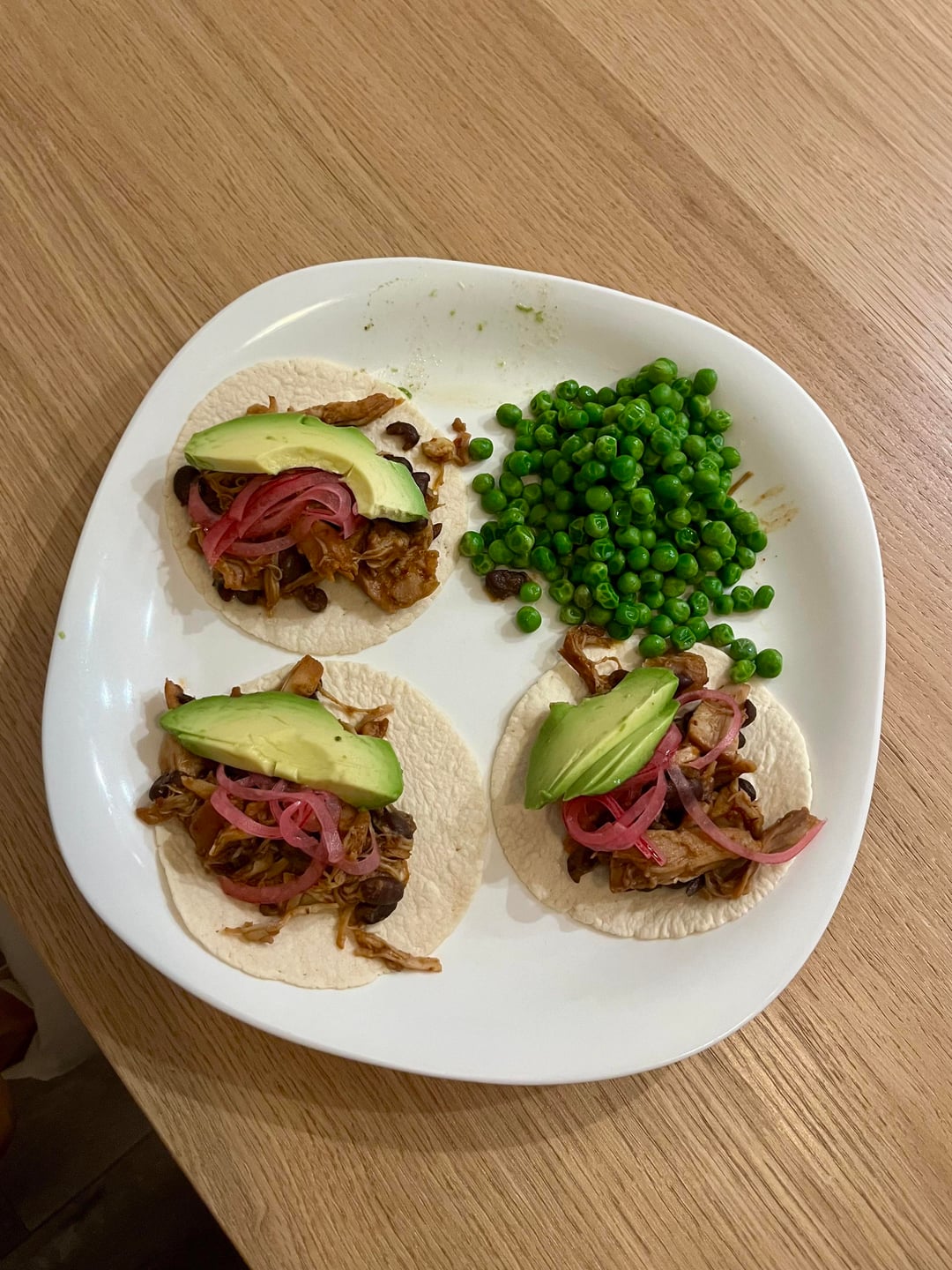 Dinner: honey chipotle chicken & black bean tacos and peas (457)