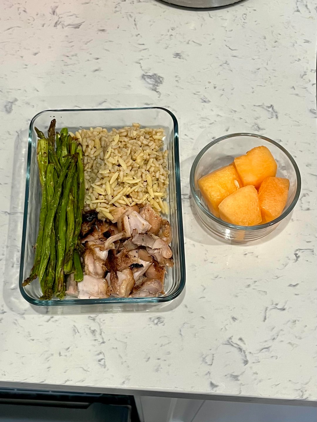 Lunch: grilled chicken thighs, asparagus, brown rice pilaf, and cantaloupe (415)