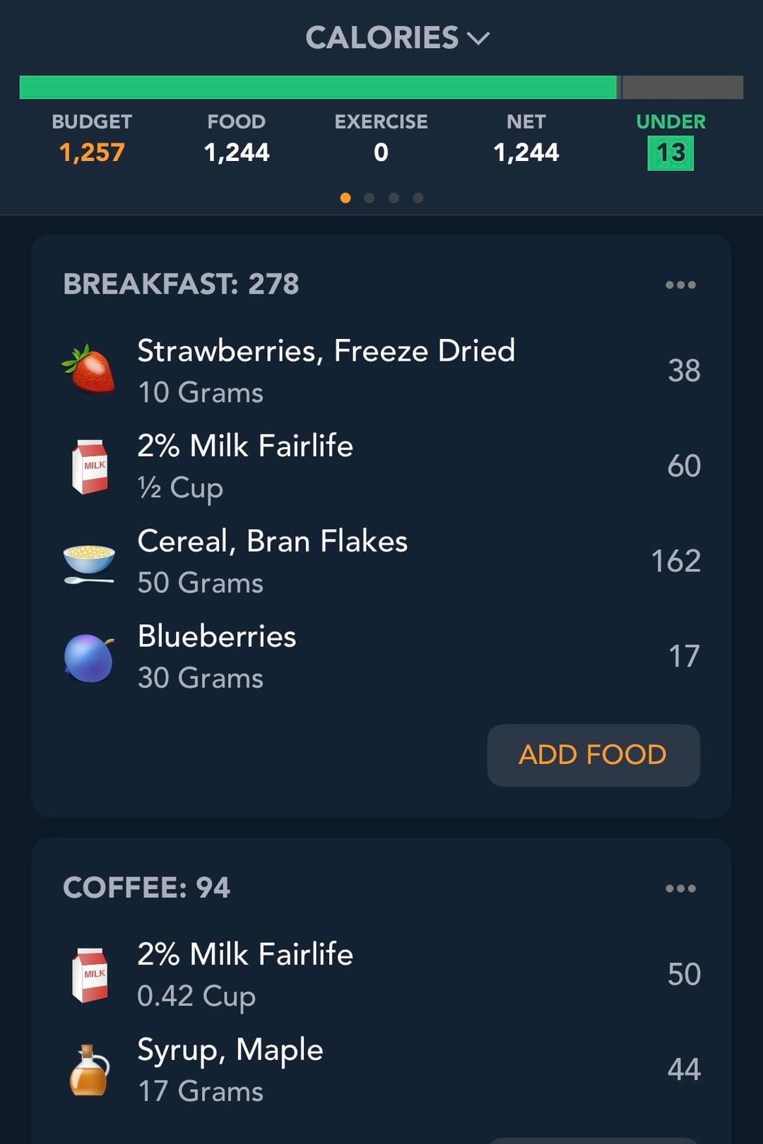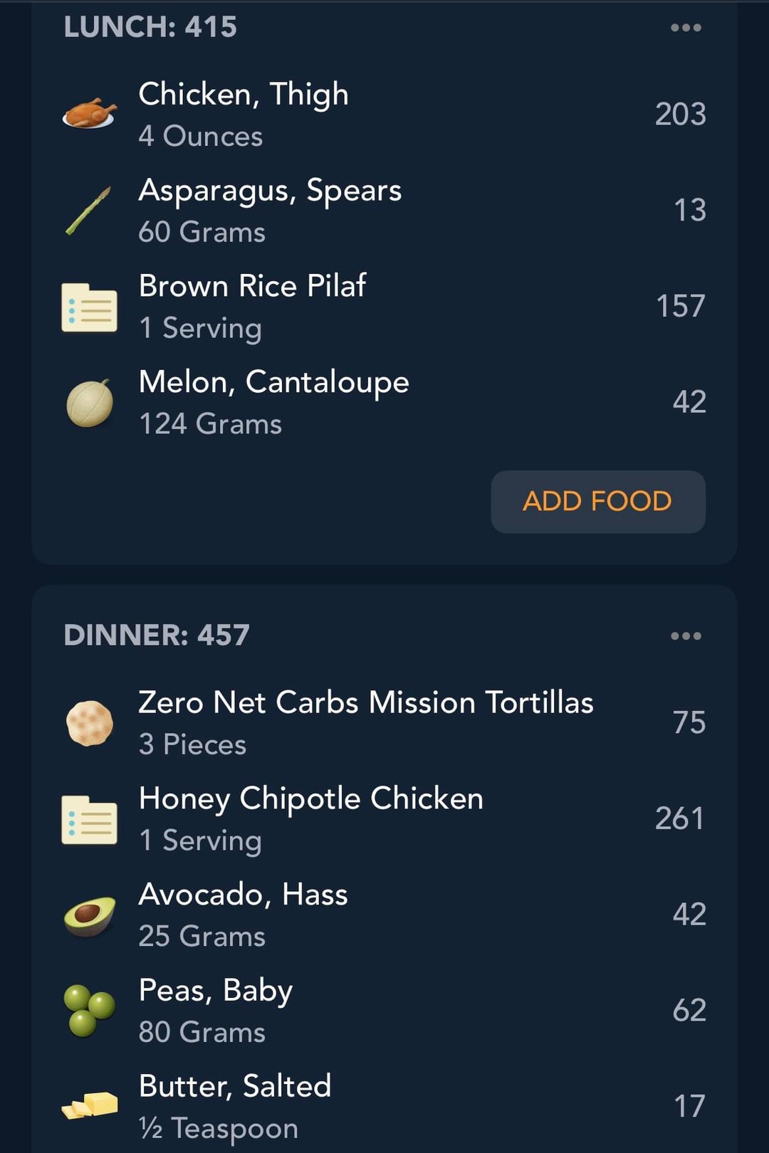 It’s cutting off my photo but I used 17g maple syrup and 1/2 tsp of butter 🙂 For my own sanity I did not track the pickled onions, the marinade on the chicken for lunch, or the spray oil on the asparagus so maybe an extra 30 calories or so