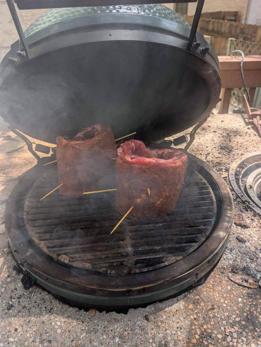 So this is a fun one – I've had this egg for over 15 years, and it has been in this table for 10 (and has not moved in at least 3 years). I set up some ribs to smoke for dinner (last picture) and went inside the house for 15 minutes – when I next checked on it, the table was engulfed in flames. I had a Thermoworks remote thermometer on it, and it was turned to slag so fast that it never reported the temp increase.