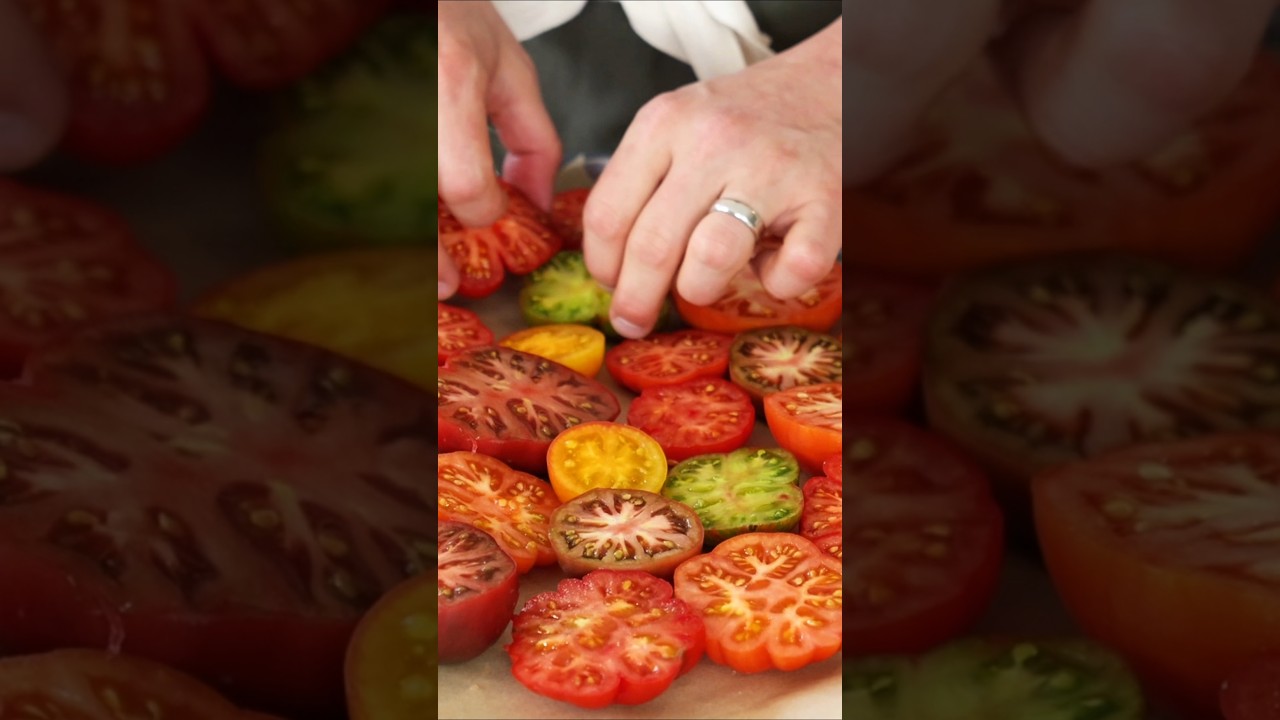 [Music] It always seems like a race of the finish when having a tomato garden in September. So to take full advantage, I make a batch of my roasted tomato and garlic soup. I place tomatoes, garlic, and onion on a tray. Then I drizzle everything with olive oil. Sprinkle with salt and then place in a 400°ree oven for 40 minutes until nice and roasted. Transfer everything to a high power blender with your favorite broth and blend until smooth. Adjust the seasoning to your liking and find the full recipe at frenchescook.com.