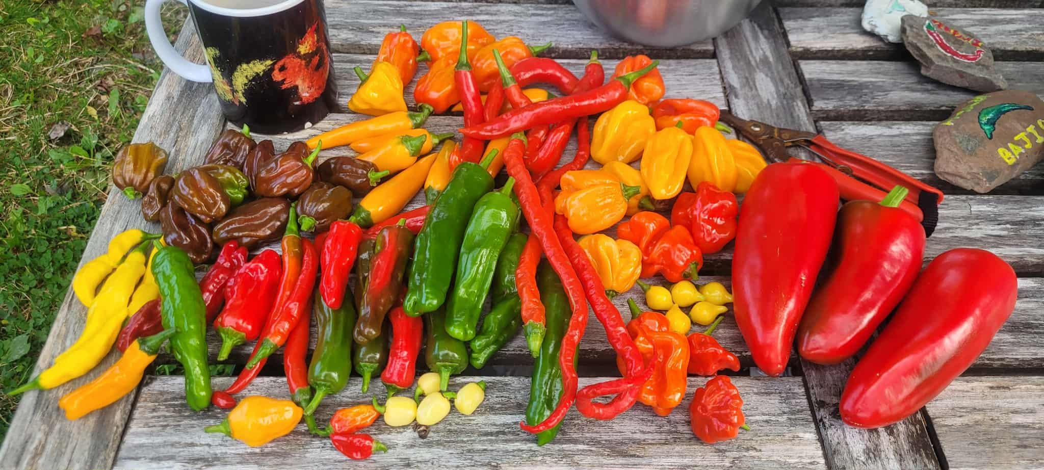 We're really ramping up here in zone 6b Nova Scotia. Starting at 12 noon and going clockwise – Primero Red Habanero, Thai Scorpion, Caribbean Red Habanero, Big Sun Habanero, Orange Habanero, Ugandan Red Habanero, Brazilian Starfish, Biquinho Yellow, Numex Joe Parker, Thunder Mountain Longhorn, Shishito, White Bullet Habanero, Datil Red, Cayenne Long Slim, Aji Mango, orange mystery pepper which is supposed to be Flaming Flare, Aji Lemon Drop, Aji Pineapple, Chocolate Habanero, and Bulgarian Carrot.