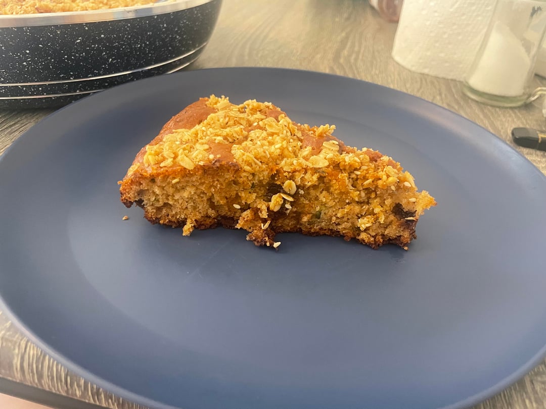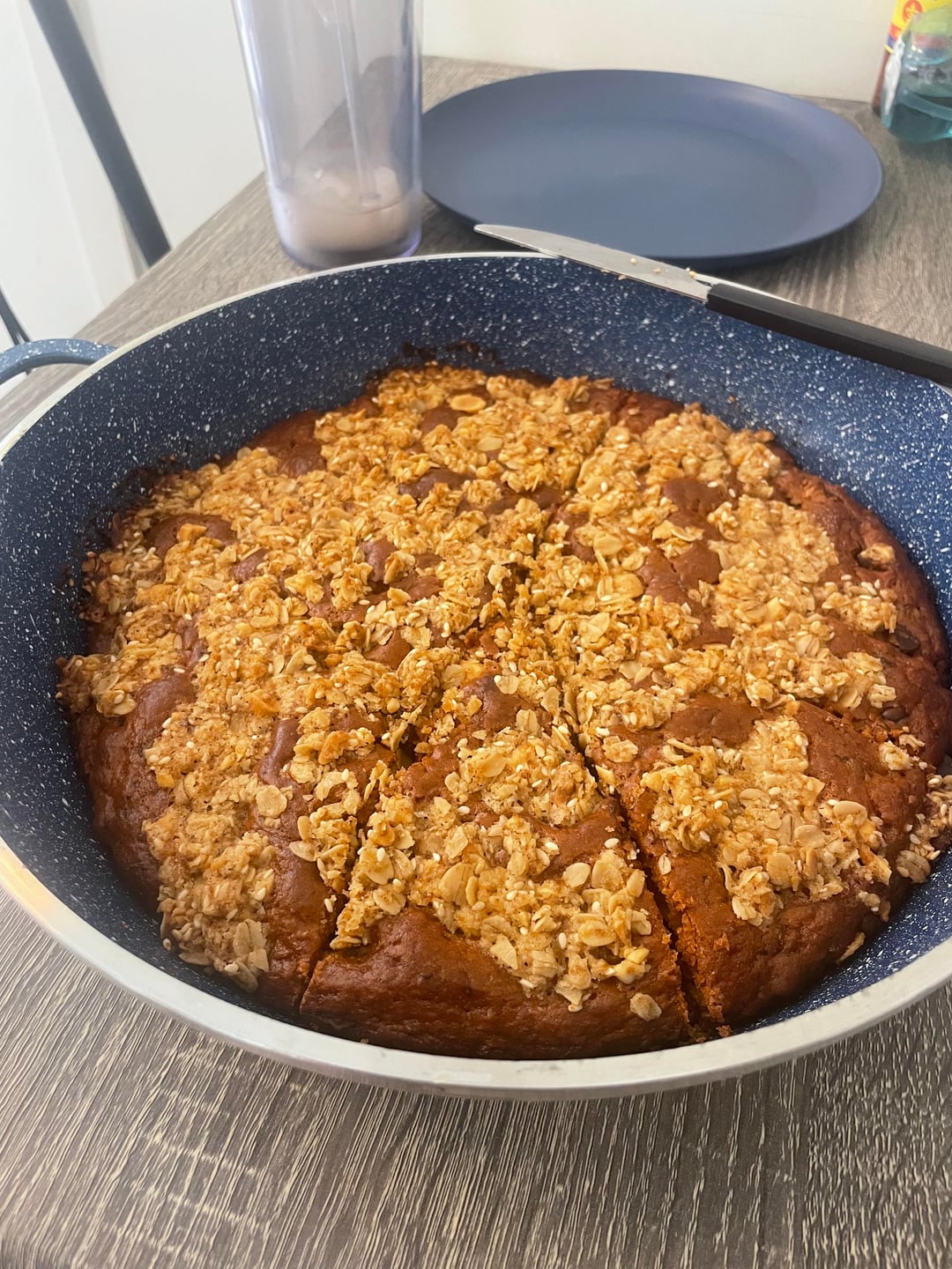 This is phenomenal! I’ve always been a fan of zucchini breads, but this one is so so so so good. The sesame oil and seeds, peanuts, and oats add such a good texture and flavor. It was a 4.99 add on I believe and definitely worth the price if it pops up again. Also ignore the round pan, I didn’t realize my 8×8 pan was in my boyfriend’s car still from the last time I made a dessert lol. I probably could’ve cooked it 5 minutes less, but it’s still great. The slightly more cooked bottom might be due to the pan change as well lol.