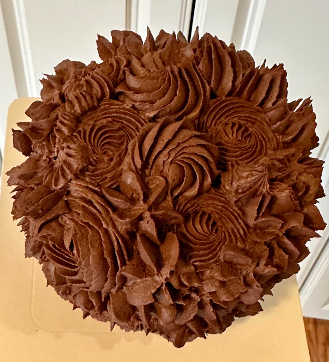 I baked several 4 inch cakes for friends and family. Triple chocolate cake (chocolate box cake with chocolate milk, chocolate pudding, and chocolate morsels). Whipped cream frosting with unsweetened cocoa powder 😊