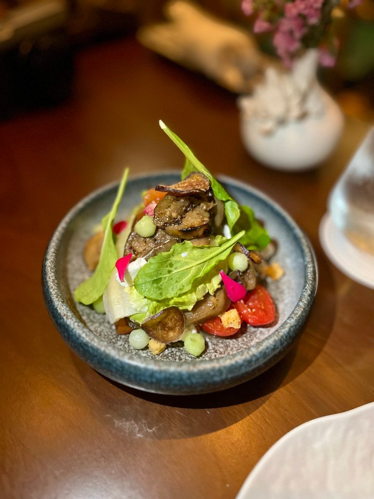This is best paired with the grilled eggplant, tomato, and goat cheese salad — a simple starter that’s slightly sweet, zingy, and fresh, providing a refreshing counterpoint to the foie gras.