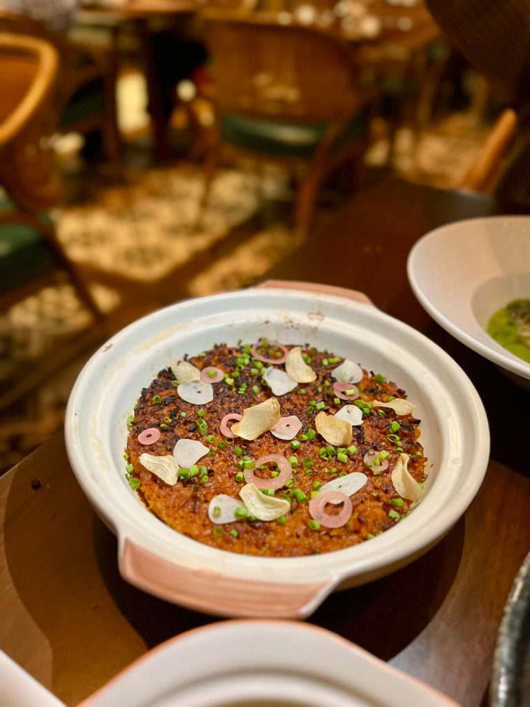 Calo’s food memories from her province continue to shape her palate — her town’s humble paksiw of garlic, vinegar, and salt eaten over rice is reimagined into Coquette’s best-selling stewed tuna roe rice using bihod, Capiz’s specialty. It doesn’t need an introduction; it cant stand on its own. The umami of the roe is bold in its flavor, rich but balanced, and makes this rice dish a rustic, hearty must-try.