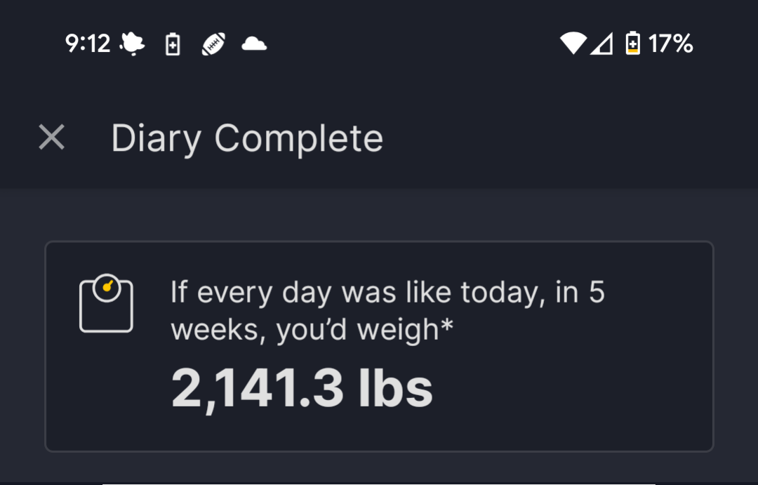 When I hit under my calorie target, the app I use likes to tell me I’m going to be 98 lbs by my target date. I don’t think so lol.