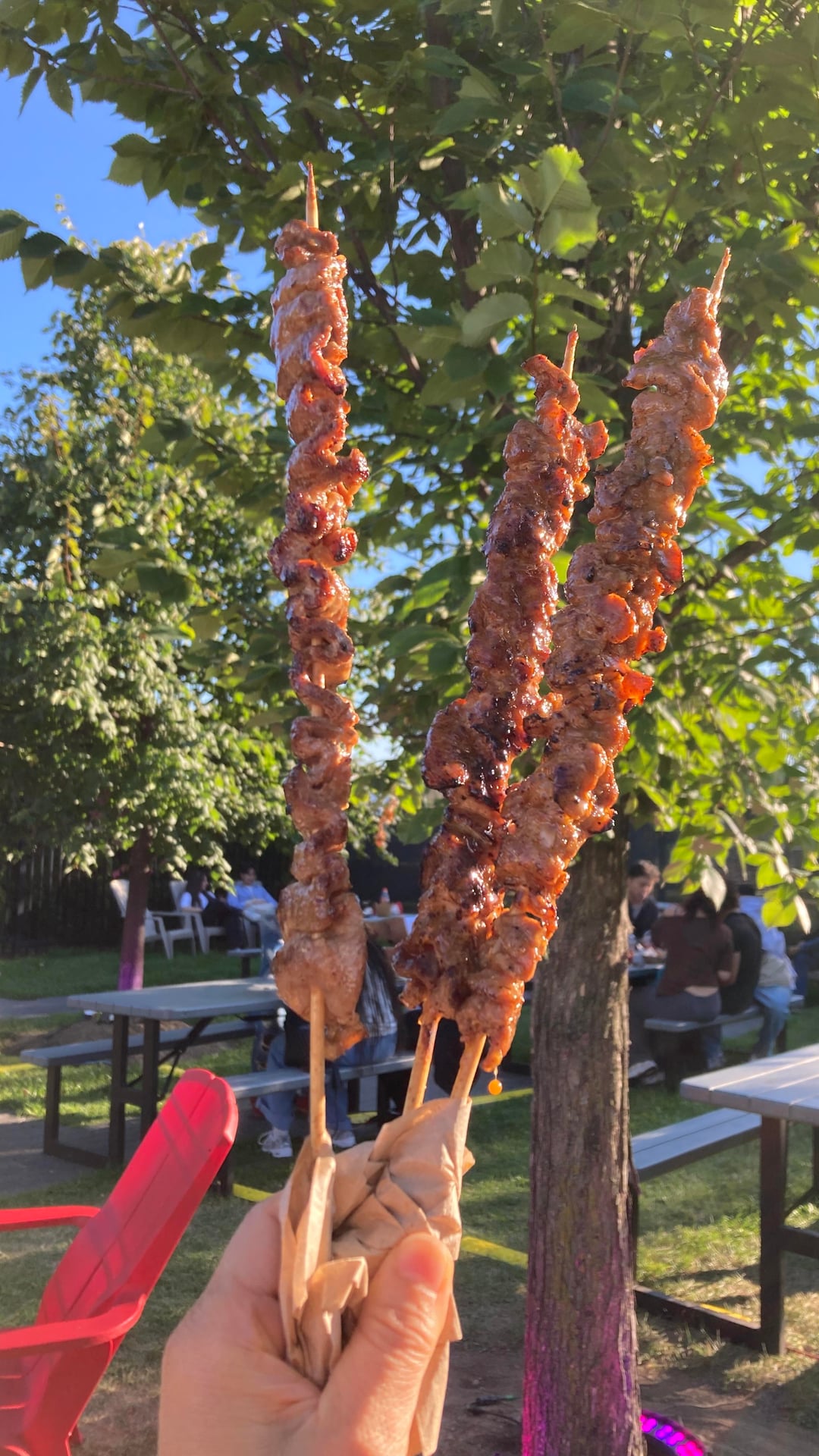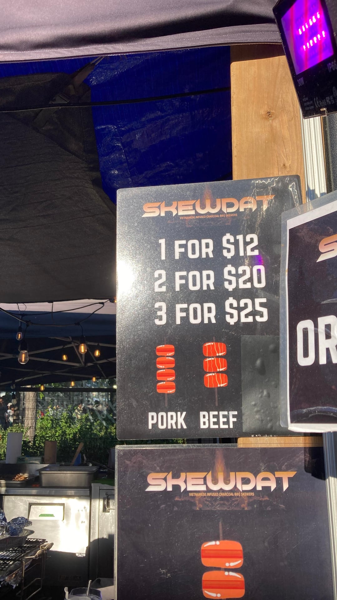 I had very decent size 2 pork skewers & 1 beef skewers for $25 at Skewart( inside Dinner in the Sky by Hotel X zone) Highly recommend that they were “a good deal for CNE” and loved this Vietnamese lemongrass infused charcoal flavour! There was line up but they moved quickly.