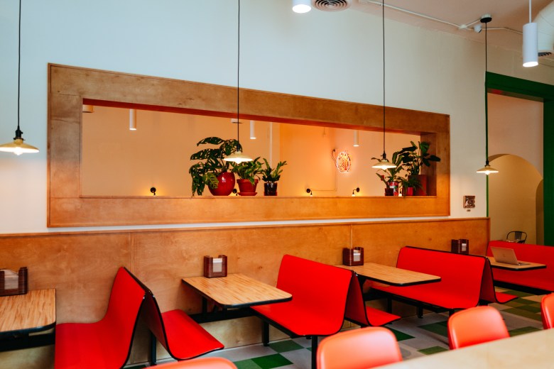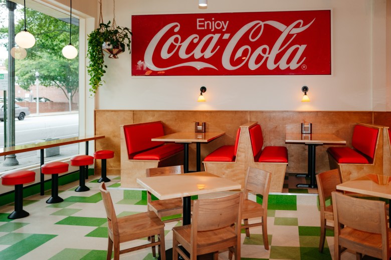 Founder Rob Birdsong said he hopes Glide Pizza’s first full-fledged restaurant will become a neighborhood hangout for Decatur residents. With a design that evokes the space-themed restaurant Pizza Planet from the movie “Toy Story,” sprawling corner booths comfortable enough to sleep in, and a geometric carpet that screams 1990s roller rink, it’s hard not to feel like you’ve teleported back to your childhood. Secondary colors, like the persimmon benches and Western ranch-themed tile floors, give Glide an especially youthful aura in Decatur.