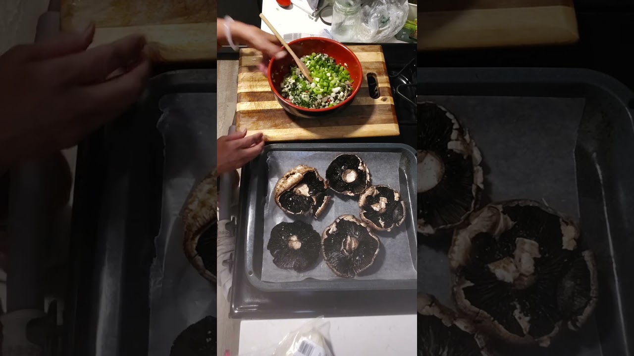 so today I am making stuffed mushrooms I have five portabella mushroom here first I want to brush it with uh oil a mixture of olive oil and sesame oil I want to brush this so it doesn’t stick even I use the wax paper and also I give a little flavor and just give a little smell this is a fres portabila mushroom but it’s still a little fragile if you’re not careful it’s easy to break apart like this one a little piece broke off during uh washing I rub a little horse but I’m not going to waste this part I will put that back that should be the first tip after I wash the mushroom so I am going to Salty my spinach for the stopping of the mushroom let turn this to medium for now and I’m using a makadamia not oil here maybe a couple of spoons full I don’t want the libs will be dry what are you doing boy boy what are you doing boy I like to wait for the skillet to warm up this is one small red onion into it I will add uh two mins cloves garlic which I add towards the end I just cook this for about a minute or two until I can smell the onions fragrance and I have here 12 OES of spinach young BB spinach which I will use this to stop the onion I don’t need to cut this small pieces once it’s done not this enough to get wel Welty the leaves cuz it will cook some more once I am baking the mushrooms add a little [Music] salt I prefer to add salt to while I’m eating instead of maybe putting too much salt this is black paper little bit more salt now the spinach is are wed turn up the heat and I want to add my garlic I want to call it down to it’s manageable to grab it with my hands to put in mushrooms into the spinach I will add a one cup of mozzarella cheese you can add any cheese you like it’s Soo hot I need a little [Music] sauce also I want to sprinkle a little salt on the mushroom also a black [Music] paper not too much because the mushroom will produce water the salt can extract the water from the [Music] mushroom you can mix any cheese you want to add to your stuffing and then you can tap with the mozzarella cheese I decided to add color to it so I add like a mixture of green means uh bell pepper and red bell pepper to it so just to give a little color and also I added half cup of shreded EDS aago uh chese here and a five spring uh onion I preheat the oven to 350 I will cook this for 25 minutes then I take it out and add the mozzarella MO moara on top of the mushrooms stopping then cook for another 5 minutes or until the cheese uh is uh melted so this is very very easy easy recipe you’re not pick that up you’re not going to eat eat okay eat the onions okay let’s mix this a little bit if you like to add protein to it you can add eggs like two eggs to mix and the vegetable stuffing could see here what I did I salvaged the broken pieces I secure it with toothpick this one I don’t need to secure I just lay it that way I want to go with the same amount first make sure I have cover it in the same amount and then I will go around and add some more this one is small so I think I can go another round safely don’t be shy to use your fingers I’m glad to have found this uh big uh mushrooms so I can add a lot of stuffing this big guy here need more stuffing this one is kind of flat flat uh bottom so the stopping will not be secure as the rest of them need a lot of helping hand see one piece is Slide putting down so that’s done and I will will put inside the oven cook it for 20 minutes take it out and add a mozzarella and cook for another uh 20 minutes oh no sorry not 20 minutes 5 minutes or until the mozzarella cheese is melting so 20 minutes passed I took the mushroom from the oven and I will add the mozzarella it’s depend on what kind of oven you’re using uh mine is gas and it’s very hot so I know I turn it off and put put this mushroom back in the oven is still going to melt the cheese because the oven is very hot so if you’re using electric oven maybe you can keep your oven uh on just to melt the cheese I will put this back for 5 minutes well 5 minutes after the cheese on the mushroom is melted or it is my stuff mushroom with spinach Bell paper green onion and Bell peer red and green bell paper with onions hold on let me get this first although I put the wax paper is still sticking to it there it is my portabello mushroom stop with spinach try it yourself and hopefully you enjoy it thank you for watching