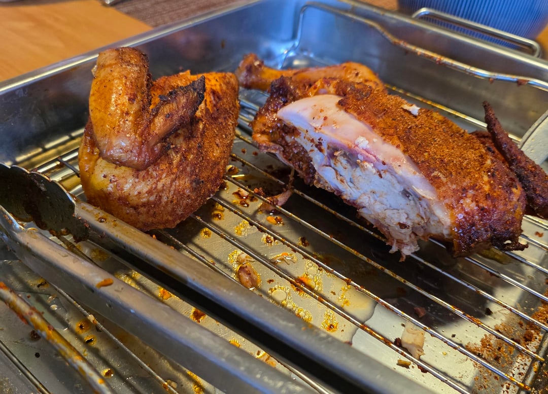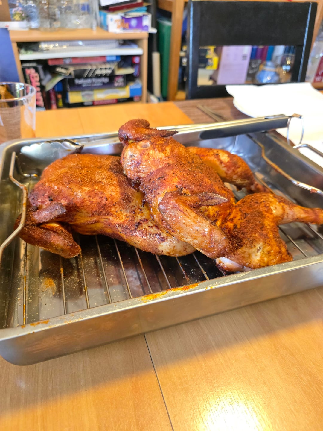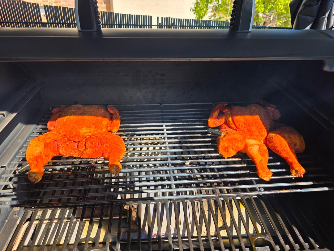 As a complete novice, after turkey leg and salmon, I tried roadkill chicken today. Each chicken weighed 3.1 pounds. I first let it smoke for 1.5 hours at 230°F. Then I heated it up to 360°F for 20 minutes until the breast reached 180°F. Let it rest for 10 minutes. I've never had such tender and juicy chicken breast.