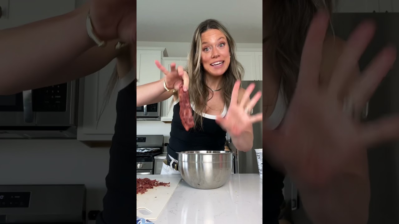 Chicken piggy ranch chicken salad. I’m a registered dietitian. And let’s get to cooking. Save over 1,000 calories making chicken salad this way. One pound of rotisserie chicken or shredded chicken. One cup of celery. 1 cup of onion. Three garlic cloves. Trust me on this. Six slices of turkey bacon. I used applegate, but use whichever one you want. And cook it until it’s crispy. A cup and a half of blended. Make sure it’s blended cottage cheese. Little black pepper. Little dijon mustard. And trust me with this, the ranch restaurant style seasoning. I did two teaspoons. You can totally make your own if you want. Teaspoon of dill. Mix her up and you are freaking good to go.