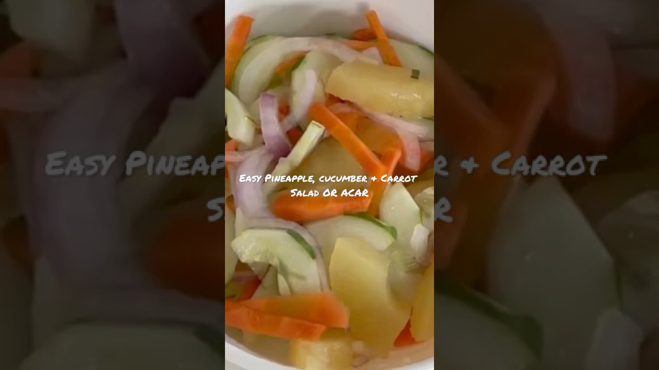 Hi everyone. Today I’m going to share with you an easy pineapple, cucumber and carrot salad or as we know it locally here, a simple acha. First I have here two cucumbers which I’m partially skinning and removing the ends of. And then I’m cutting both into halves and then into another half again. Now I’m removing the seeds of all the cucumbers. This is to ensure we do not get a very runny kind of salad. And I’m slicing all the cucumbers into 1/4 in thick slices. And I’m cutting the carrot into like match thick size pieces. And then the pineapple pieces go into this mixture as does one big red sliced onion. This is to give it more flavor. You can also add in a sliced red chili if you want. I’ve just placed two heaping tablespoons of natural brown sugar and some salt in a bowl. Now I’m adding 3 tablebspoon of natural white vinegar into the mix and I’m giving it a vigorous stirring until the sugar melts. This mixture is then sprinkled all over the fruit and vegetables in the glass dish. Once that’s all done, we’ll cover this glass dish and put it in the refrigerator to let it get cold until serving. Hope you have enjoyed this video. Till the next one, folks, do tune in again. Thank you very much. Sweet.