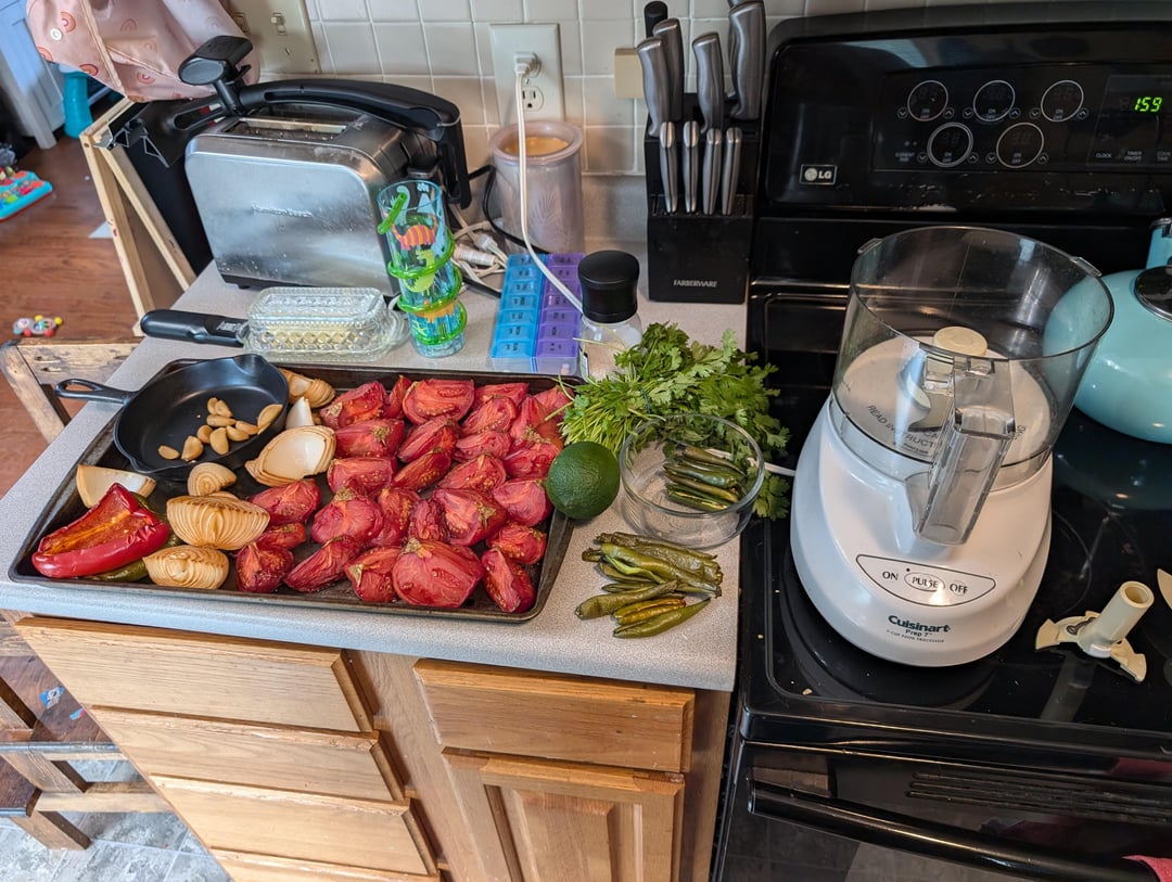 4-6 large beefsteak tomatoes, 2 jalapenos, 2 serranos, 1 whole head of garlic, 1 white onion, 1 lime, Cilantro, And Smoked salt!