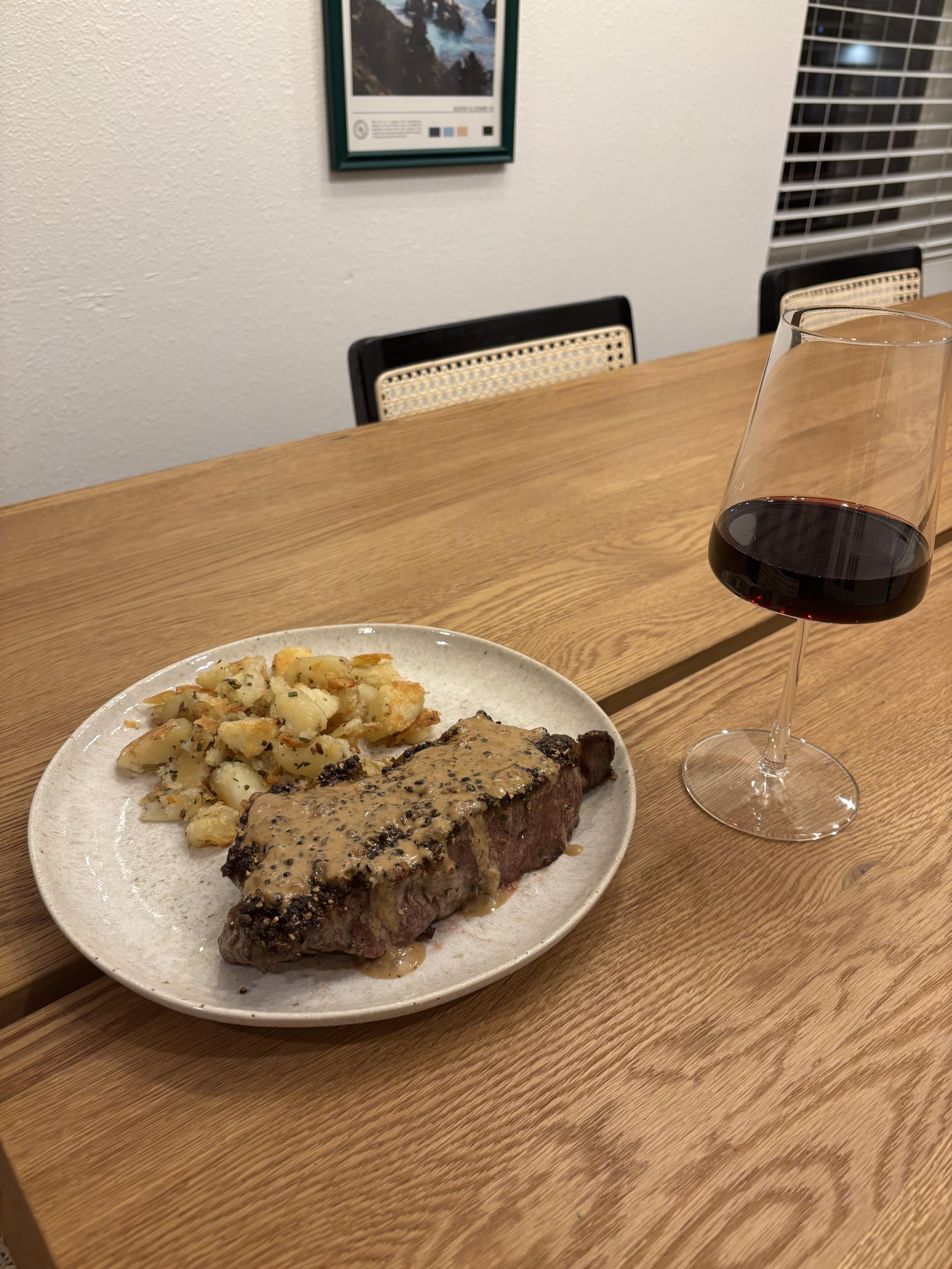 First time using this recipe, and won’t be my last! Went with strip steak instead of filet mignon. Served with Kenji’s crispy potatoes and 2017 Châteauneuf du Pape. by wwwdottomdotcom 6 Comments wwwdottomdotcom 1 month ago Recipe link: https://www.seriouseats.com/steak-au-poivre BrownMtnLites 1 month ago do not look very crisp CoysNizl3 1 month ago “Crisp” FreeBroccoli 1 month ago Au poivre is my favorite way to enjoy a steak. oldmaninatincan 1 month ago good choice on the 2017 KetoLurkerHereAgain 1 month ago With the wine, that would be a $100+ meal at a restaurant. Nicely done!