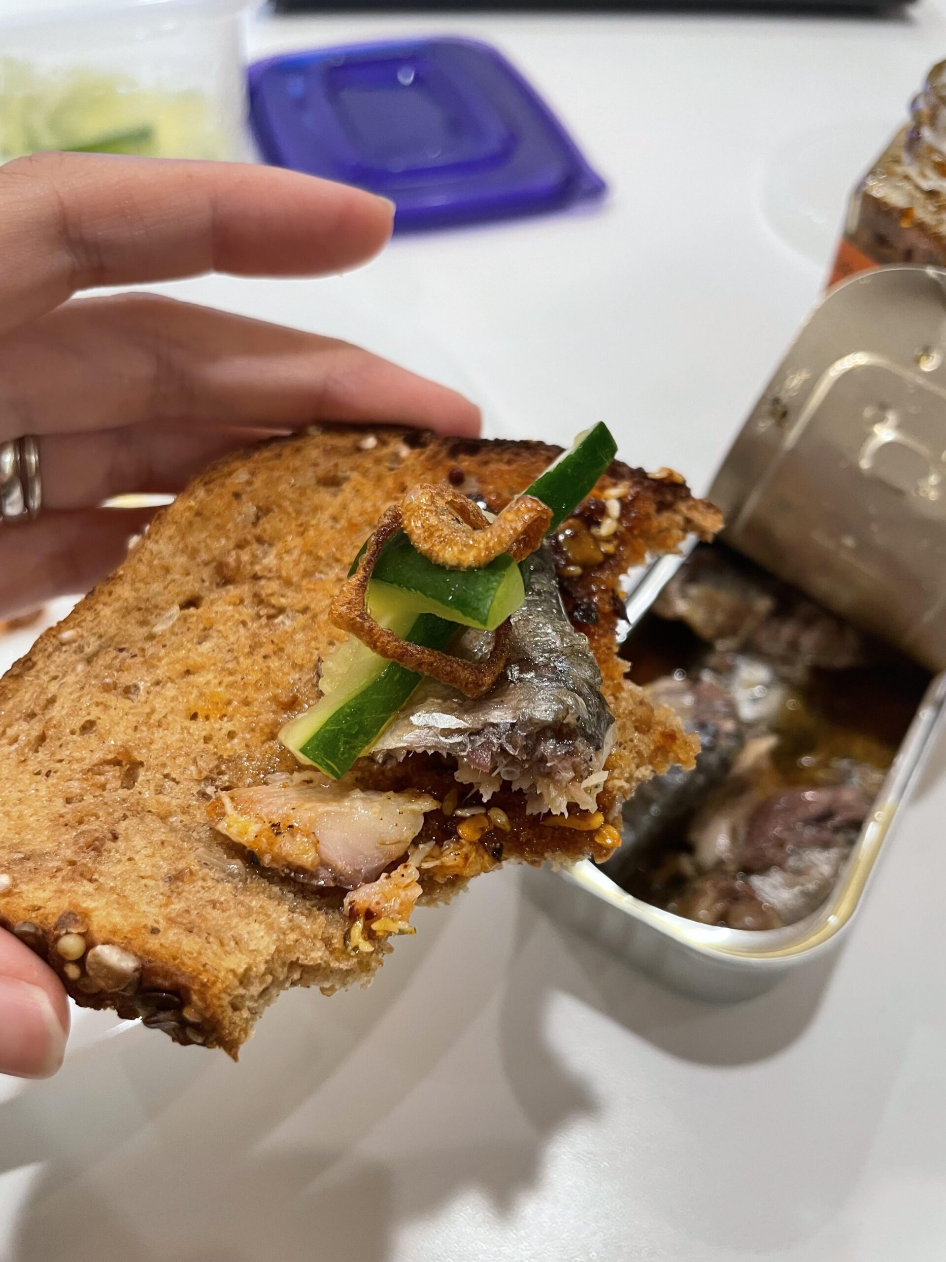 Garlic salt zucchini + nut and seed chili oil + fried shallot + buttered toast + spiced sardines 🙂 by tealeaf_egg 1 Comment tealeaf_egg 3 months ago Just got the most yummy shit in the fridge and ate it all together 🙂 so good. Sardines: Flower Spiced Moroccan sardines. loved the bonus soft carrot and pepper and cucumber slice at the bottom. Garlic salted zucchini: leftover from the zucchini preparation in the zucchini etc pizza on Serious Eats. a bit crunchy!Nut and seed chili oil: From Taiwan, it’s chili oil with sesame seeds, cashews, and 11 other nuts and seeds. It’s like salsa macha. Fried shallots: Made them myself! Also used some of the spicy sauce leftover from Buldak Chicken spicy ramen packets.Â