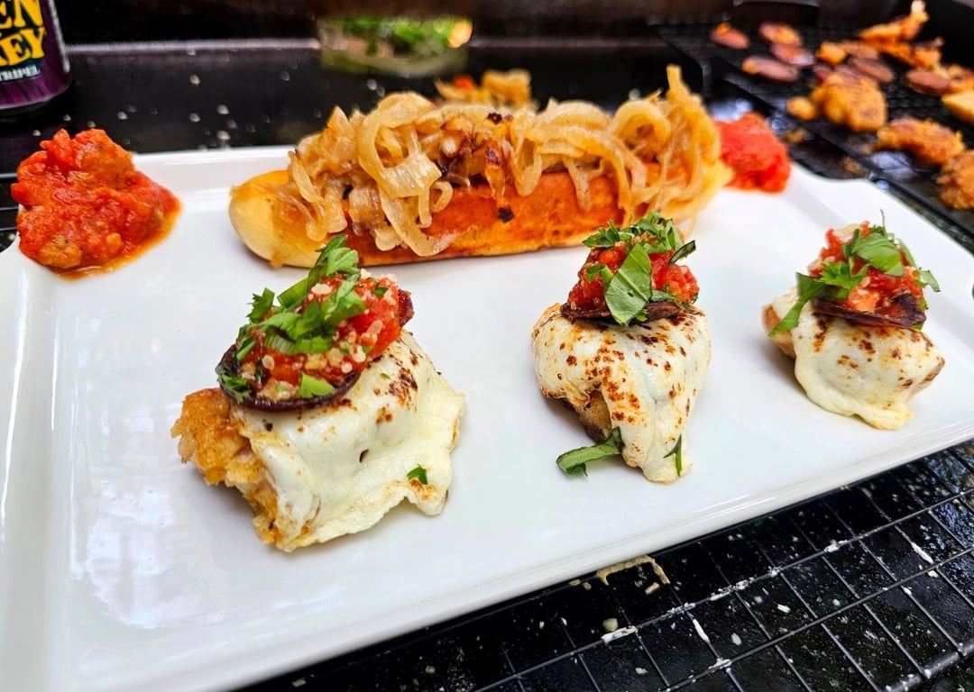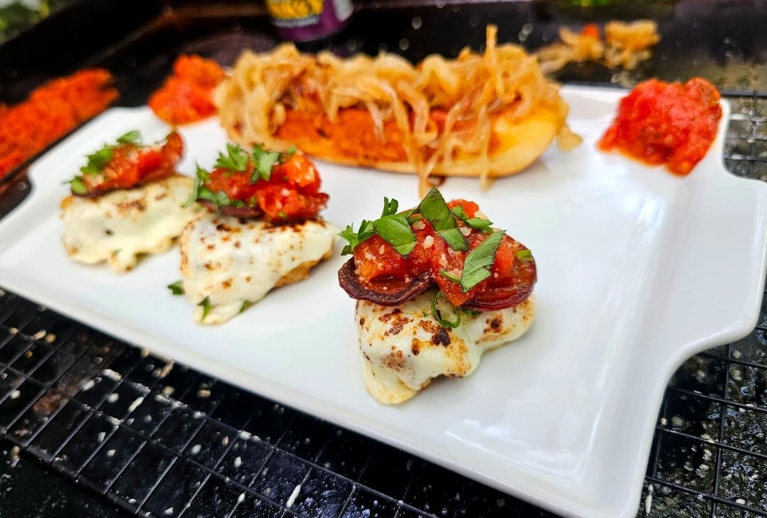 Sauce and mozzarella slices right on the top, when the cheese starts to melt, put it on a wing and hit it with a torch to add some color. This is where the roni cupage helps 😅 they hold the sauce in place, then sprinkle with some scallions, parsley, and basil. Cover the breadstick with the onions and enjoy!