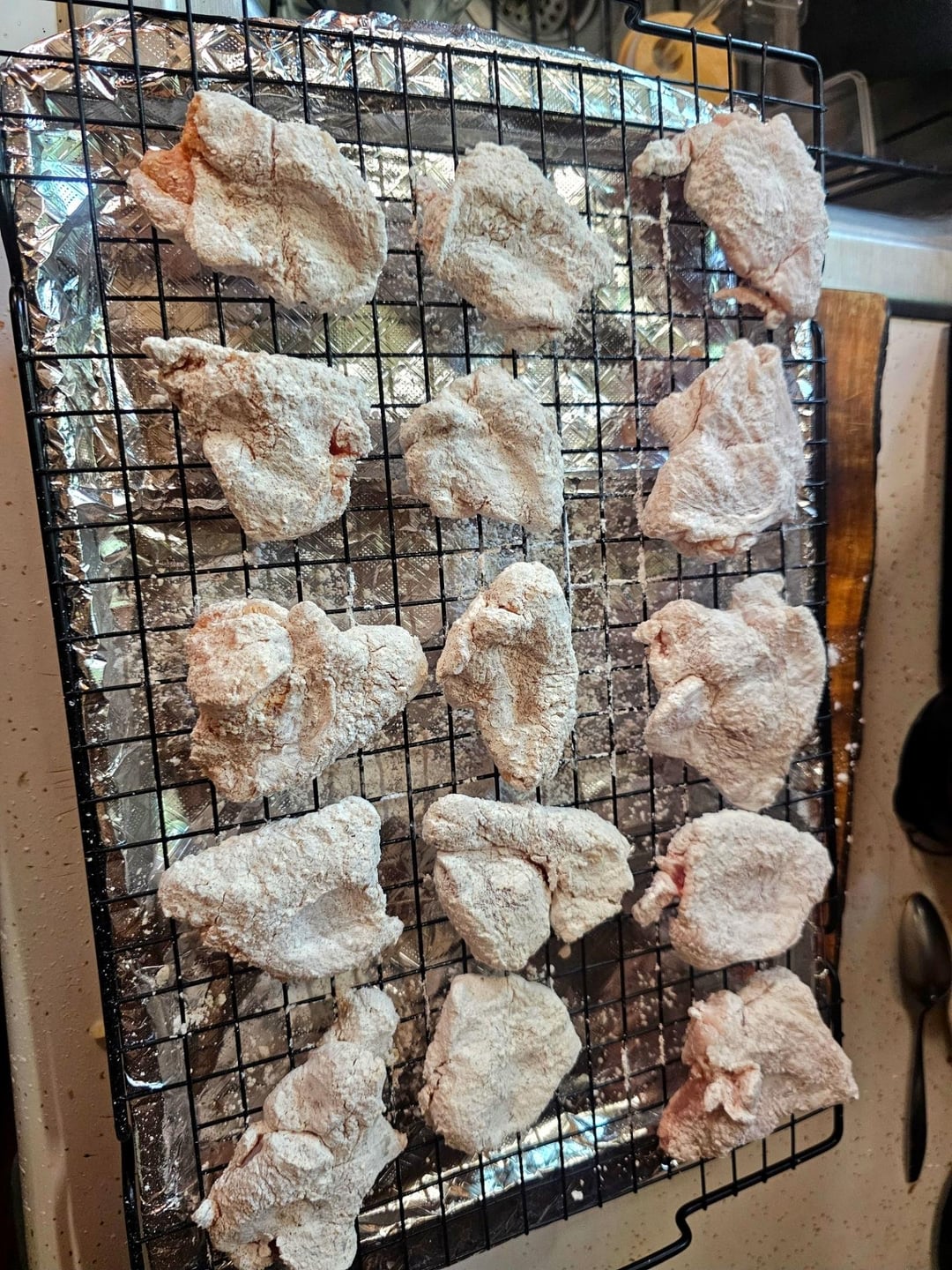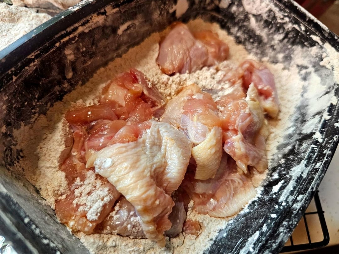 Shake the chicken in cornstartch with salt, garlic, and onion, then rack it so it dries out, this helps get a little more crisp since they aren't being deep fried.