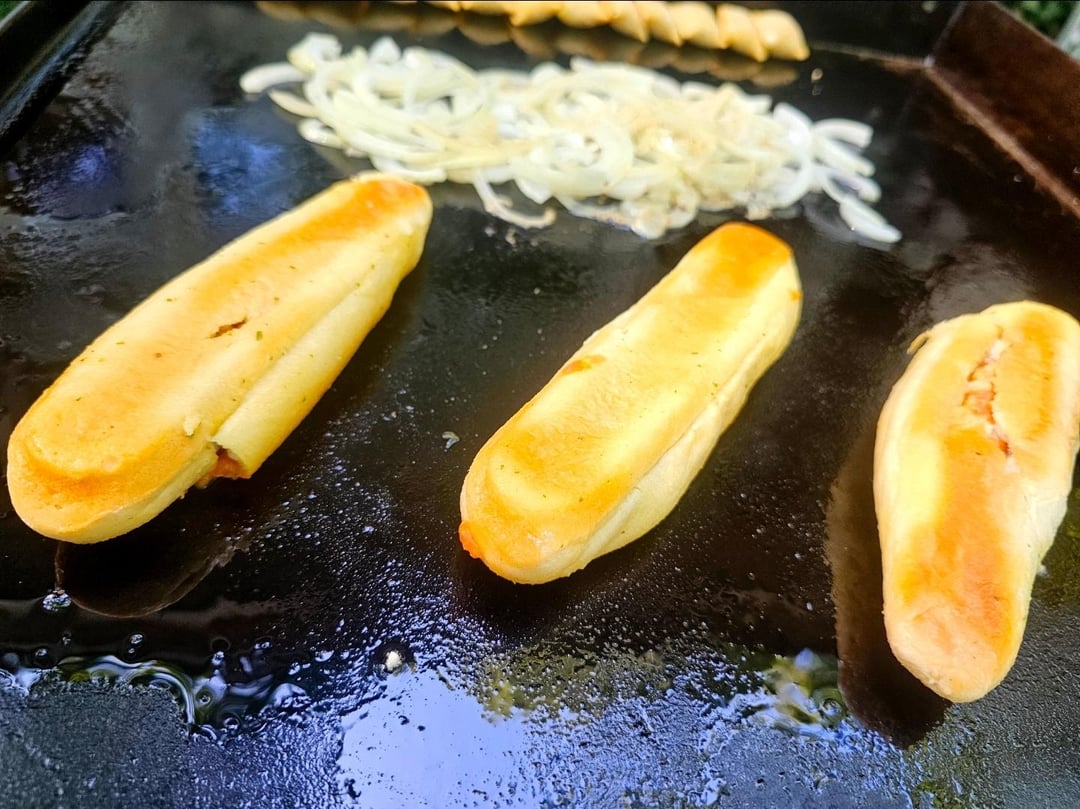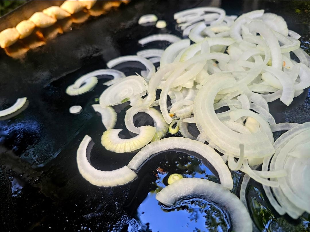 Start with the onions since they take the longest and push them off to the side with some snacking pizza rolls 😆 I wasn't sure how long the breadsticks were going to take to cook through but it was less time than I thought so those could be started later, I racked them off to the side to keep warm without burning the bottoms.
