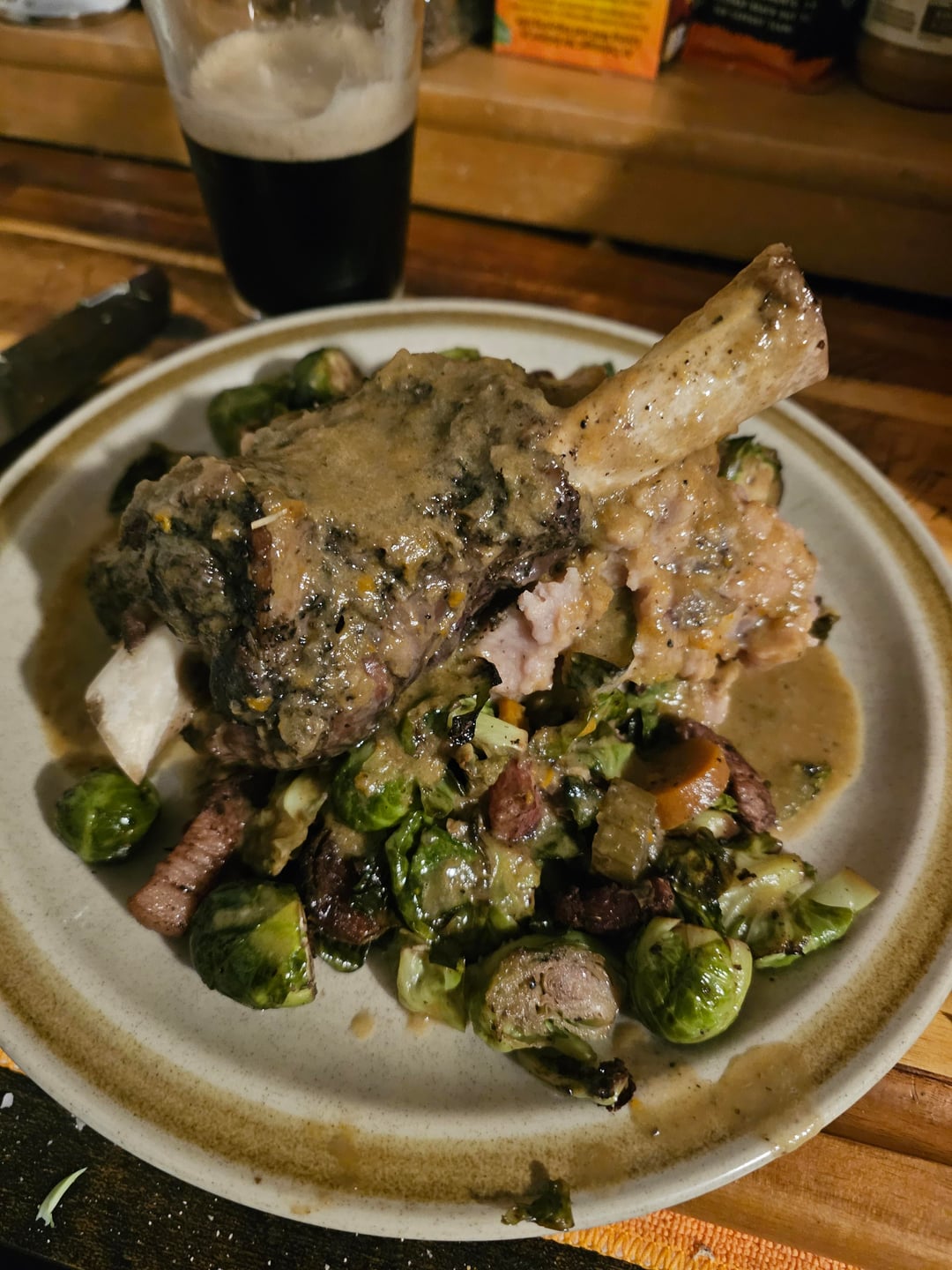 Slow braised lamb shanks and mashed potatoes with Brussels sprouts and bacon. Azrael got none of it.by Lork82 1 Comment 1ApprehensiveGrowth1 2 weeks ago Instantly made my mouth water