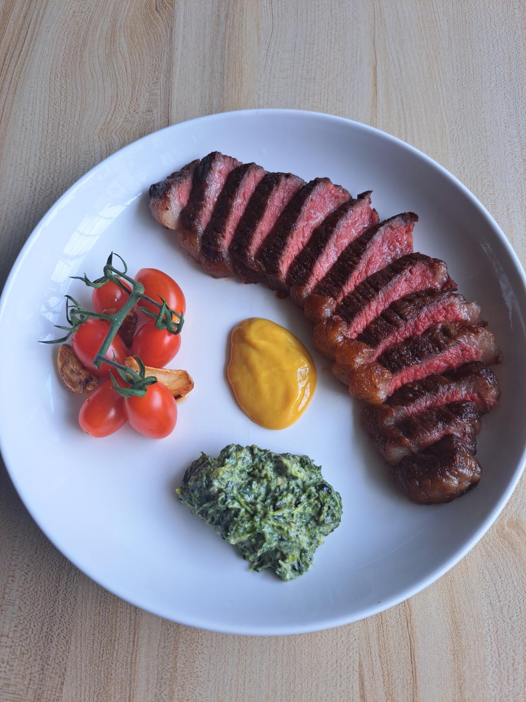 steak plate: creamed spinach, baby roma tomato, honey mustard
