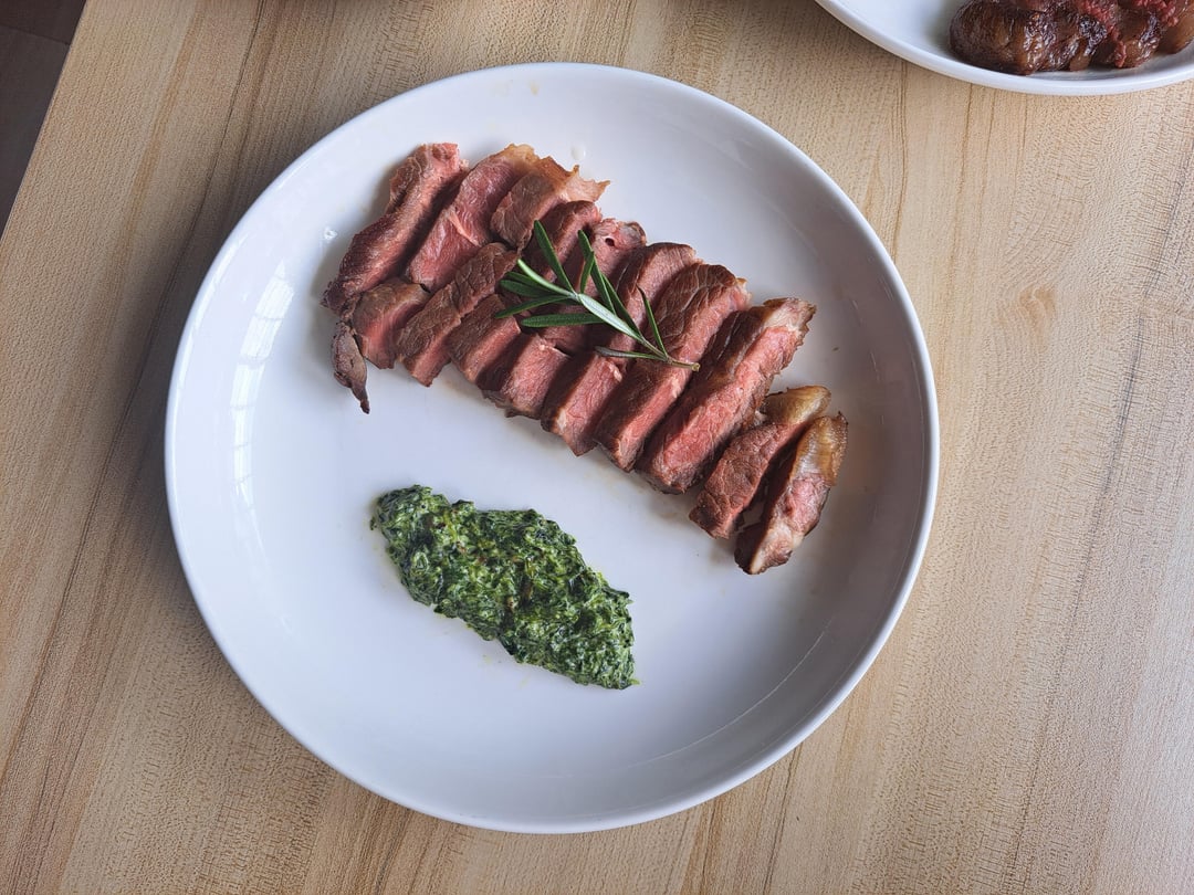 The steak-tomato-spinach plate is filled out better but as a dish, seems meh as far as an appealing composition. I think it is reductive when things are plated without touching.