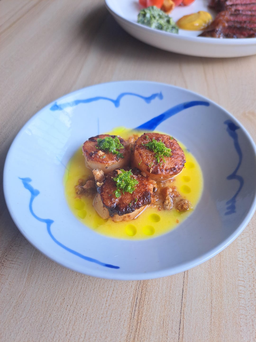 scallops: toasted anchovy crumbs, lime zest, herb oil, beurre monte