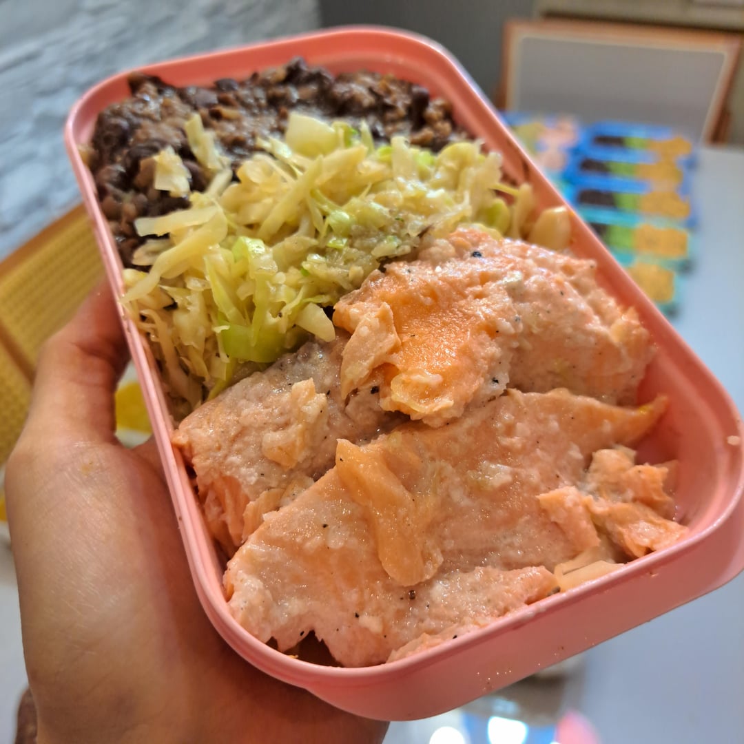Brown rice (cooked with garlic, onion, salt, olive oil), black beans (cooked with garlic, onion, salt, olive oil, in the pressure cooker), sautéed cabbage (garlic, onion, salt, olive oil) & baked salmon (salt, black pepper, lemon and garlic — baked for 13 minutes at 230 °C / 450 °F). I add a splash of soy sauce, sesame seeds and scallions right before eating.
