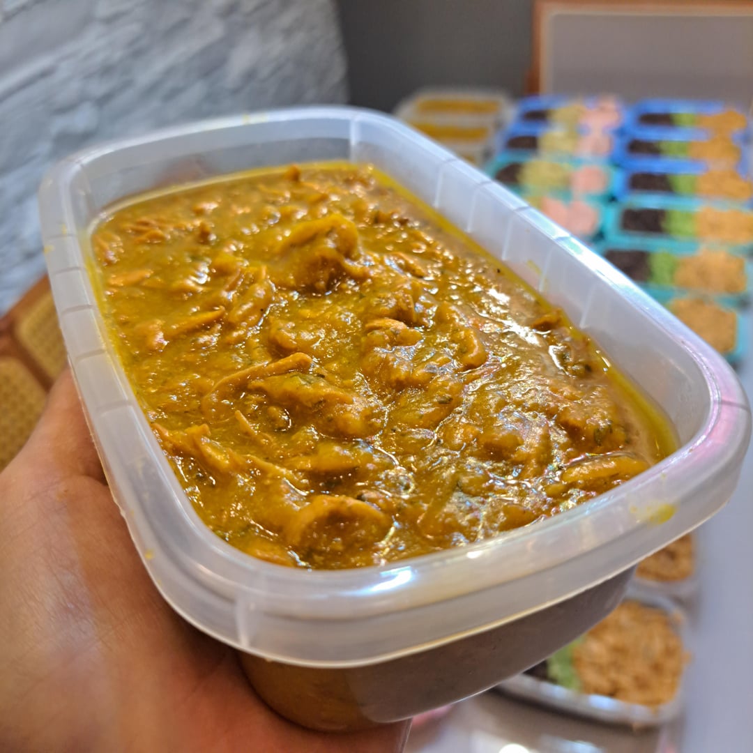 Kabocha pumpkin soup with shredded chicken breast (marinated overnight with paprika, black pepper, garlic powder, chili flakes. Cooked in the pressure cooker for 30 minutes, then blended the broth with the cooked kabocha squash, added parsley and scallions, and mixed everything together).