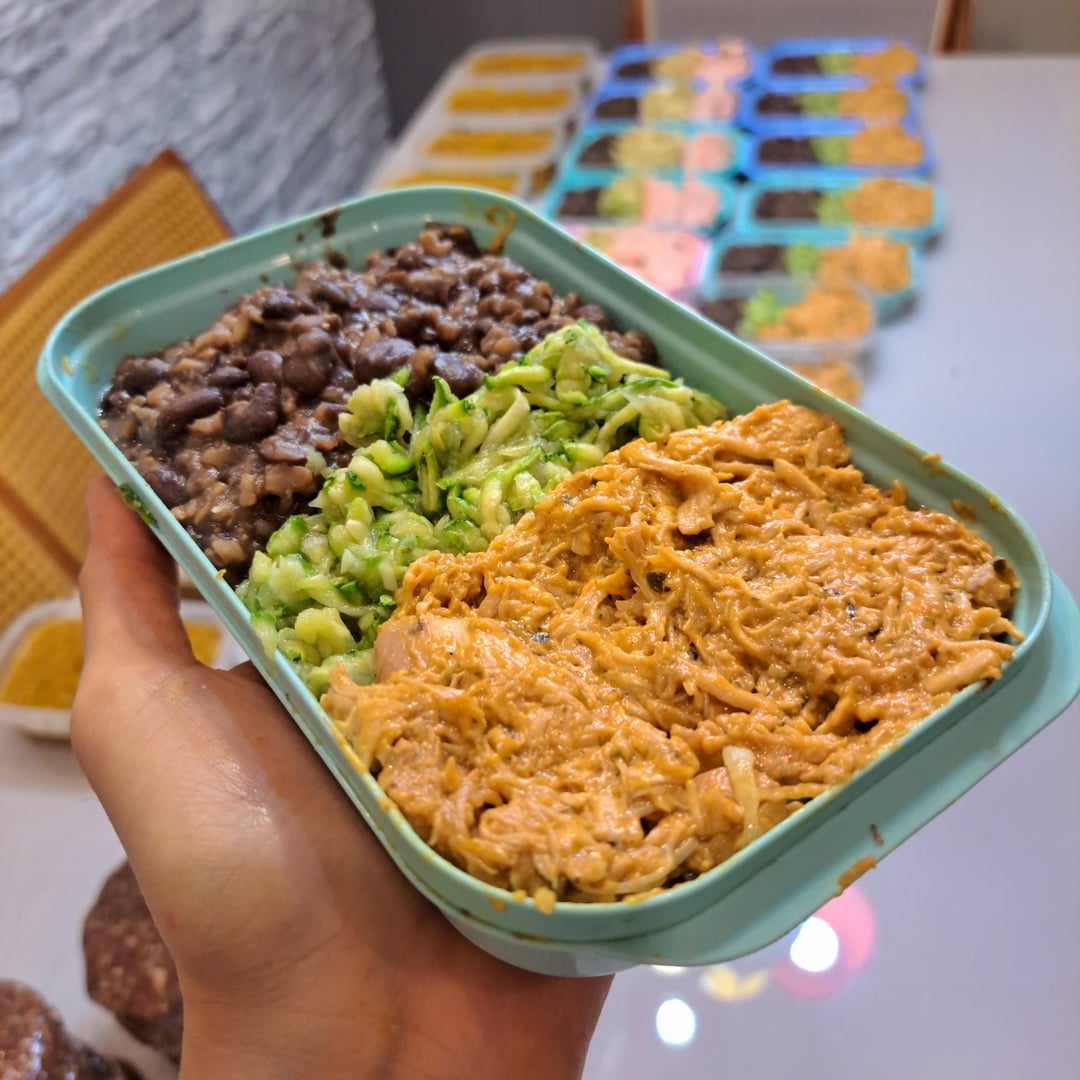 Brown rice (cooked with garlic, onion, salt, olive oil), black beans (same as above), sautéed zucchini (garlic, onion, salt, olive oil) & shredded roasted chicken thighs (marinated overnight with salt, lemon juice, iogurt, lemon zest, paprika, black pepper, garlic powder, onion powder, dried parsley — baked ~30 min at 230 °C / 450 °F).