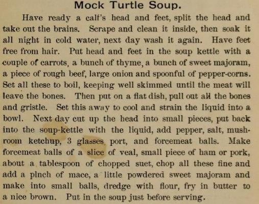 Mock Turtle Soup (Source: Two Hundred and Fifty Recipes by Grace Church Sewing Circle, Brantford, Ontario, 1900)by TanglimaraTrippin 5 Comments TanglimaraTrippin 2 months ago Too complicated? Here’s a simpler [Potato Soup](https://imgur.com/a/ZoSsmTY) from the same source that sounds tasty. TanglimaraTrippin 2 months ago [The cookbook](https://imgur.com/a/zXvFpM6)Find the whole thing [here](https://imgur.com/a/zXvFpM6) AQueen4ADay 2 months ago And we think going to the grocery store is a pain. Cooking was tough way back then. They used every part of the animal. Fomulouscrunch 2 months ago Seems like a bit much to approximate the flavor of a turtle. And I haven’t had it, but I doubt it’s great enough to go to these lengths. KatzyKatz 2 months ago Misread as mock turtleneck soup
