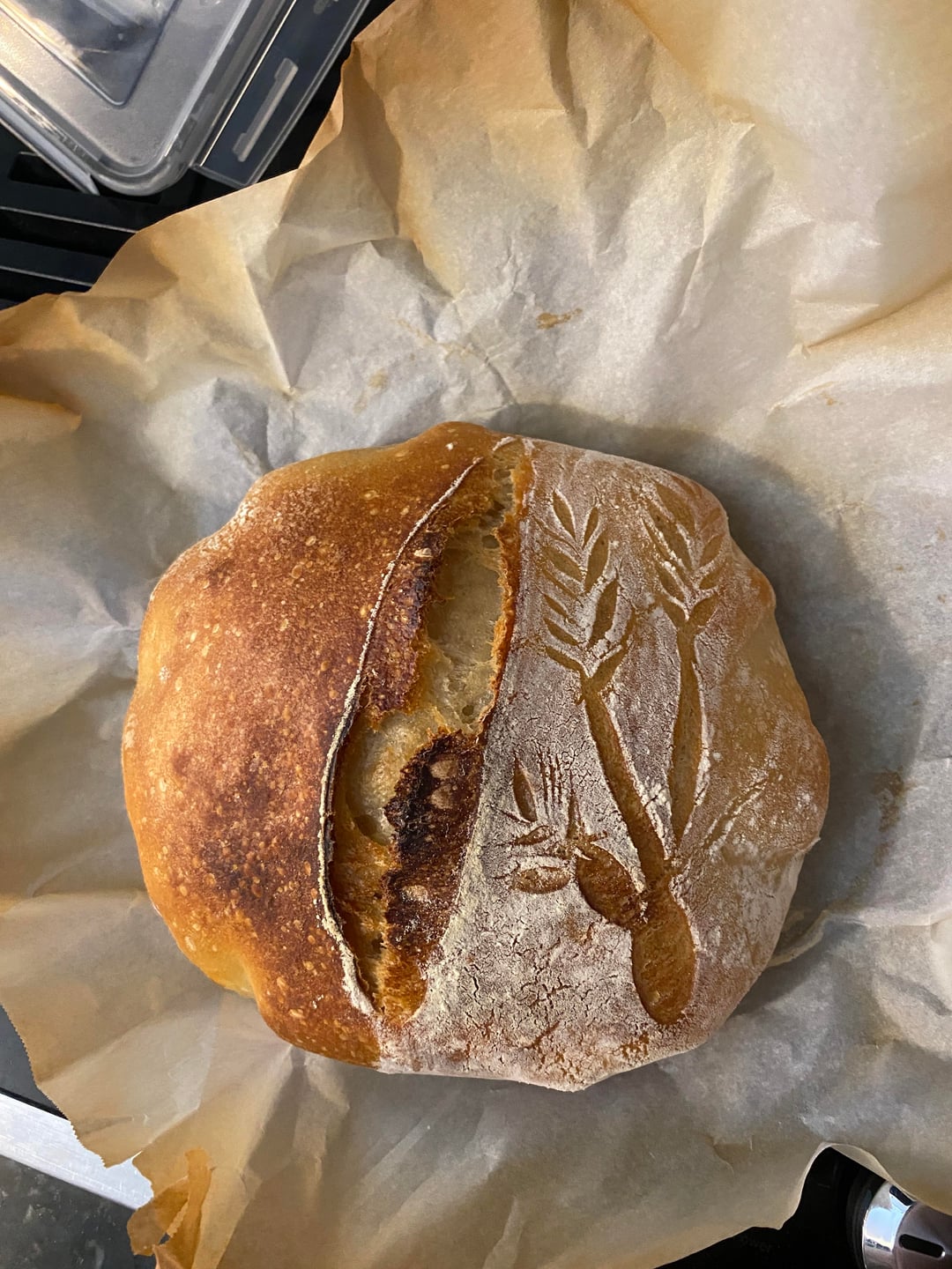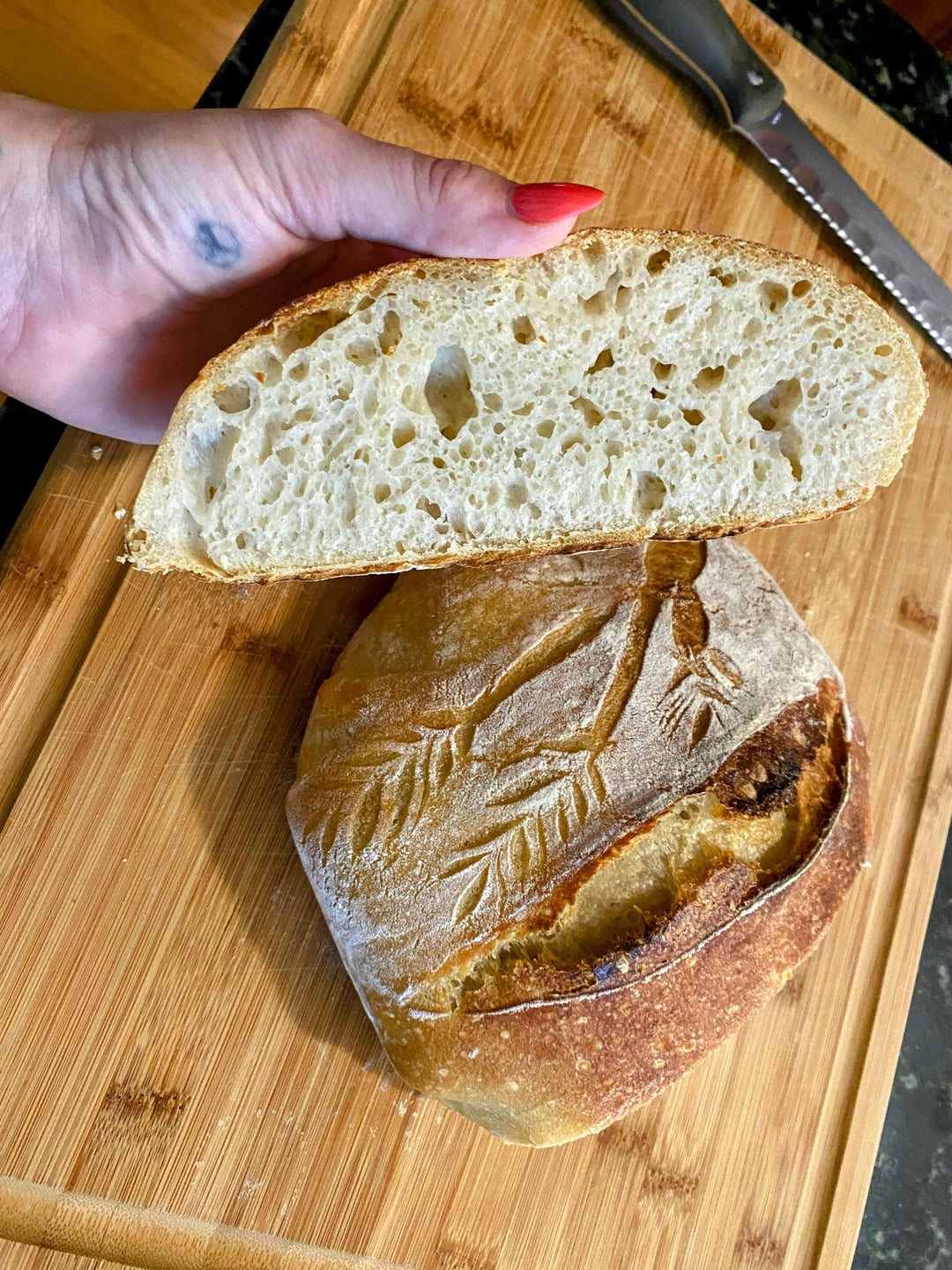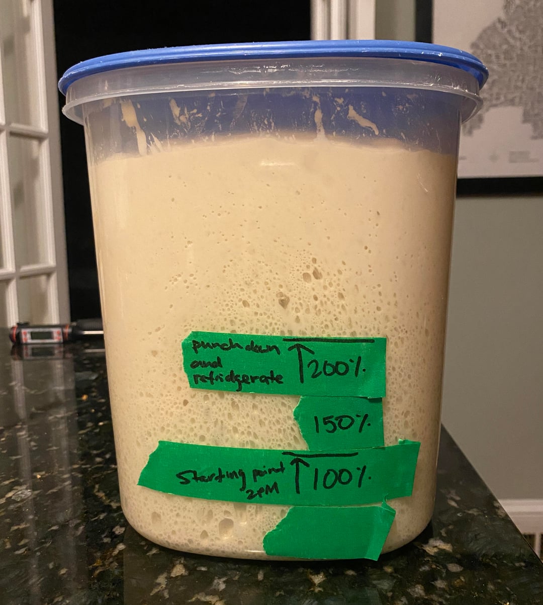 See last photo of monstrously quadrupled dough: I forgot to punch down and refrigerate it before I rushed out to catch a play. Oops! I finally deflated and shaped it about 10 hours after leaving it to bulk ferment. It still turned out pretty great! Both loaves were baked in a Dutch oven.