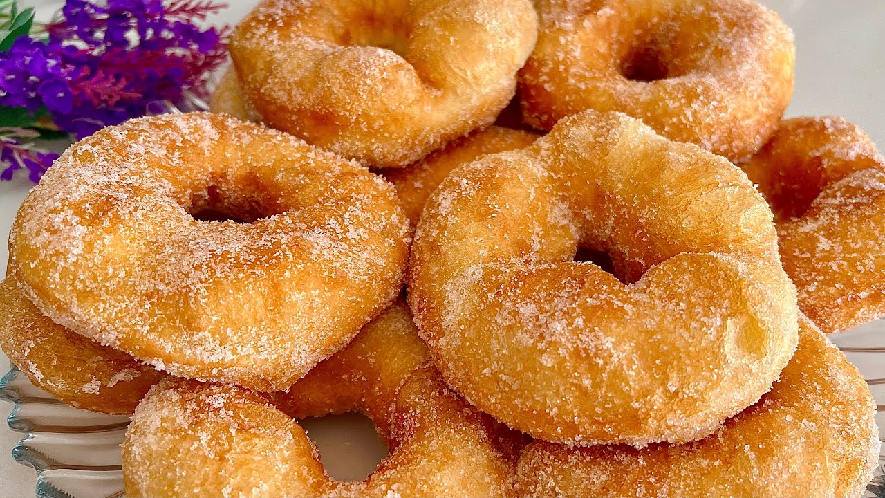 Welcome to this new video 500 g of flour 12 g of fresh brewer’s yeast 1 tablespoon of sugar hot water (about 350 m) let it rise for 10 minutes orange zest an egg salt to taste mix well add the rest of the flour (half first) work the dough for a few minutes a little oil hot oil cook over low heat we pass them in the sugar