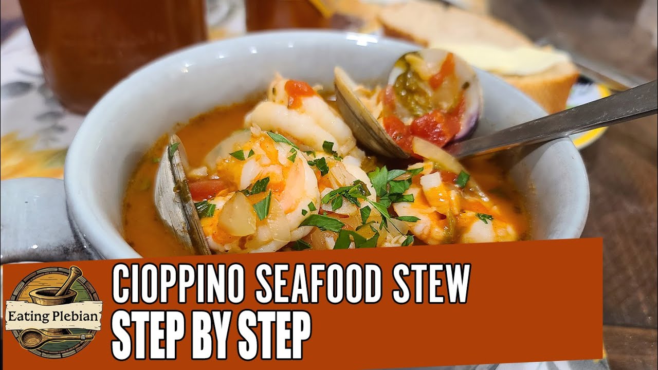 [Music] evening and welcome to eating plebeian. I’m almost giddy to bring this one to you. Uh it’s one of my favorites and something I don’t make near enough. And uh that’s because this one, even though the eating plebeian website uh we try to focus on more budget related foods, um this one kind of blows it a bit, but uh I had access to some shrimp and had access to a little bit of cod. If you were to go out and buy these, it’d be a little bit beyond the $20. I hope you will forgive me. But, um, this recipe once you get past that, um, is just such a great one. Uh, love to eat this. Uh, chop pino, if I didn’t just say it. It’s seafood stew. Uh, it’s credited to the Bay Area, San Francisco. And, um, there’s, uh, several things like it uh, around the world. Boys, um, and and some others. And there’s a lot of variations just within the Chopino, uh, category that, uh, that that different people make, but, um, we’re going to be sticking fairly closely to the original. I am going to riff just a little bit when it comes to what the seafood is that’s available on the inside. Let’s go ahead and get started with the ingredient list. [Music] sitting next to my Dutch oven, which is waiting patiently off onto the on the stove top there. I’ve got one pound of uh jumbo shrimp. They’ve been peeled and devained. I’ve got a pound of little neck clams. They are alive. And u I’ll be using those to toss in. Uh here is something. And I left this one in front. If before you cook them, you find one that’s open, discard it. So, that’s just a uh little trick there to uh make sure that your food safety is okay. I’ve got a pound and a half of cod. You’ll remember the cod from the other evening. This is actually still fresh. Got it today. Um seafood stock. Now, I’ve got some pre-made seafood stock. If you have the ability and the time, whatever, I urge you to make your own. And I would love to make my own, too. But uh I didn’t have nearly the carcasses or heads or bones or anything like that in order to make it. And for whatever reason, and I did check around here, my stores don’t sell stuff like that. And you would think that they would have pounds and pounds of uh shrimp peelings and things like that, but no, no, they don’t. So, I’m stuck with the seafood stock now for uh for the interim. Anyway, I’ve got two 8 oz bottles of clam juice. That’s going to really introduce a zing uh into things. Uh I’ve got 3 and 1/2 cups of uh diced tomatoes over here. That’s two 14 1/2 ounce cans. That’s with the liquid. I did not drain that out. I’ve got a 1/2 of a large onion that’s chopped. I’ve got three sticks of celery. By the way, do you discard your greens? I don’t. I figure that anything that you would normally want to put greens into anyway, like um parsley or cilantro, if you’ve got celery greens, why don’t you just put those in? That’s just a me trick right there. Uh I’ve got two shallots. Those are chopped up. Uh some parsley. Uh it’s about I don’t know four tablespoons or so. I’m going to use that for garnish. Uh three to five cloves of garlic that’s finely minced up. And I’ve got uh one half of a bulb of fennel. And now this is actually one half of a bowl uh of a bulb because the thing was a monster. It was like a softball. Uh so I’m only using half of it and that should be plenty. I need a couple of tablespoons of uh tomato paste. I don’t know how much I have left in that one. So I’ve got a spare back behind the tomatoes. And finally, one cup of uh dry white wine for later on. We’ve definitely got some uh bread over there I’ll be putting into the oven. So, this is fantastic. All right. Now, I was actually using a two-tiered system that I forgot even to bring in. I’ve got some uh additional herbs and things that we’re going to be using. Uh I’m going to use a tablespoon of oregano, a pinch of red pepper flake, however much you want. You can use almost as much as I don’t know a/ teaspoon if you’d like. Um I’ve got some thyme. You can use uh fresh obviously is fantastic. Uh ground is what I’ve got. So I’ll be using about a teaspoon and a half to two teaspoons of that. And I’ve got two tablespoons of extra virgin olive oil. And so I need to pre-start up my Dutch oven. And then we want to get that warm. It’s on medium heat right now. Uh, this recipe, yes, there’s a lot of prep. I get that. Um, once you get past that prep, everything is pretty much a dump in, sauté, add, add add, add add, add add, and you’re done. So, it is uh a really simple recipe when you look at it from the number of operations that you have to perform. So, we’re going to let this heat up and I will be back with you in just a minute. All right. We’re uh all warmed up here. I uh separated off those spices just to complete the look, I guess. I don’t know. So, I’m going to go ahead and I’m going to add in the olive oil. This is going to be a very light sauté. Normally, you would not want to use extra virgin uh in uh in something like this, but I believe that we’re going to get away with it. And so I’m going to add in my onion, my couple of sticks of celery. [Music] There we go. So I need to stir that around. What happened to my [Music] [Music] So, all my root vegetables are in there. I didn’t actually say it, but I added the shallot. And this is not going to take long. I’ve got this fairly warm. Obviously, I don’t want to brown these. I just want to get it about halfway towards translucent. I’ve I’ve often wondered if whether or not I should just go ASMR. [Music] I know that uh my halting speaking style is not for everybody. I get it. I don’t even like it. But I don’t know when your brain derails you every third. It tends to puts a a hitch in my lifestyle step, I guess. I don’t know. All right. And now I’m going to go for the garlic. [Music] All right, the tetanus. And we’re just going to get this nice