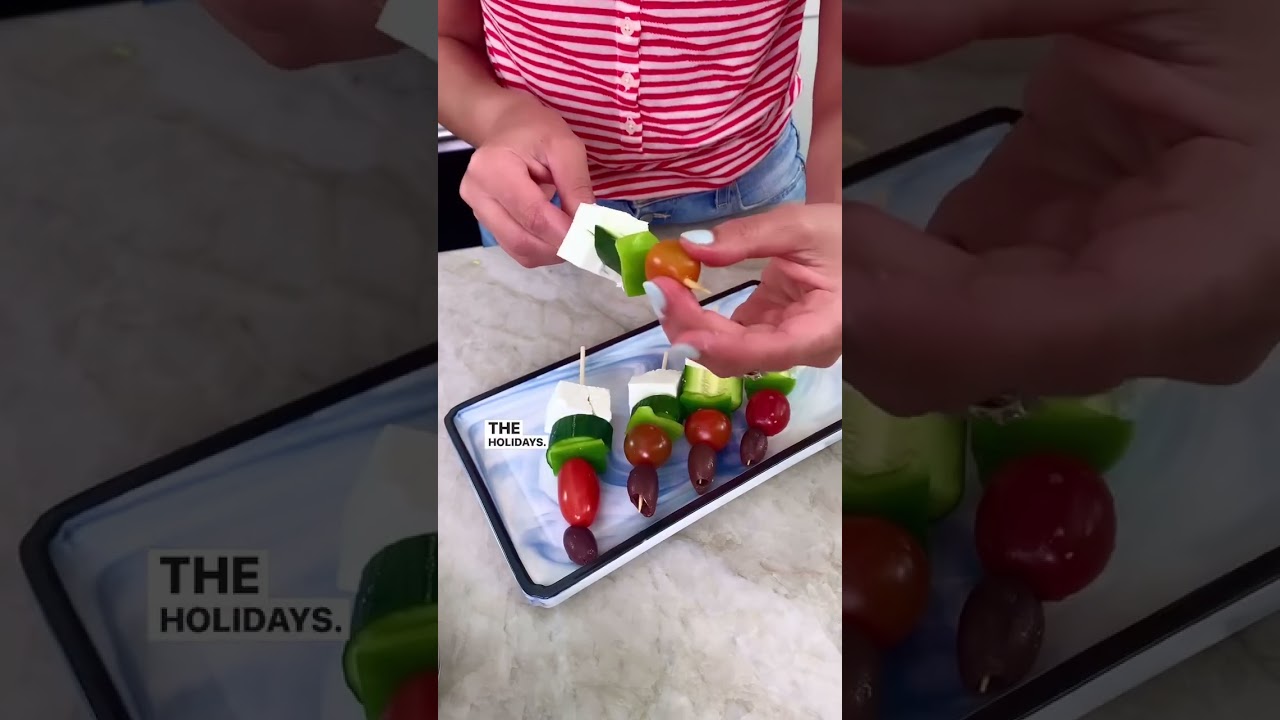 Everyone loves Greek salad, and why not serve it on a skewer for the perfect party bite? That’s right, Greek salad skewers. This is one of my favorite go-to appetizers, especially around the holidays. So, for New Year’s Eve, go ahead and thread your favorite feta cheese on a little skewer and add the veggies and with your olive and then make a little dressing to go on top for the perfect finish. Everyone loves these and they take less than 10 minutes. Happy new year.