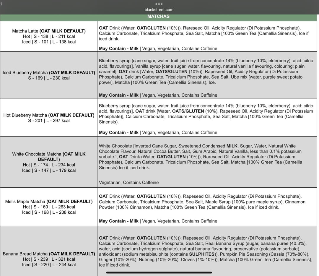 None of the calories match up and I’m so confused about which one is the most accurate. For example, the white chocolate matcha is listed as 135-165 cals in the first menu, 155-185 cals in the second, and then in the third menu the calories range from 147-234 cals. There are some items on the menus with even greater differences across various menus. Can someone please tell me which one is most accurate?