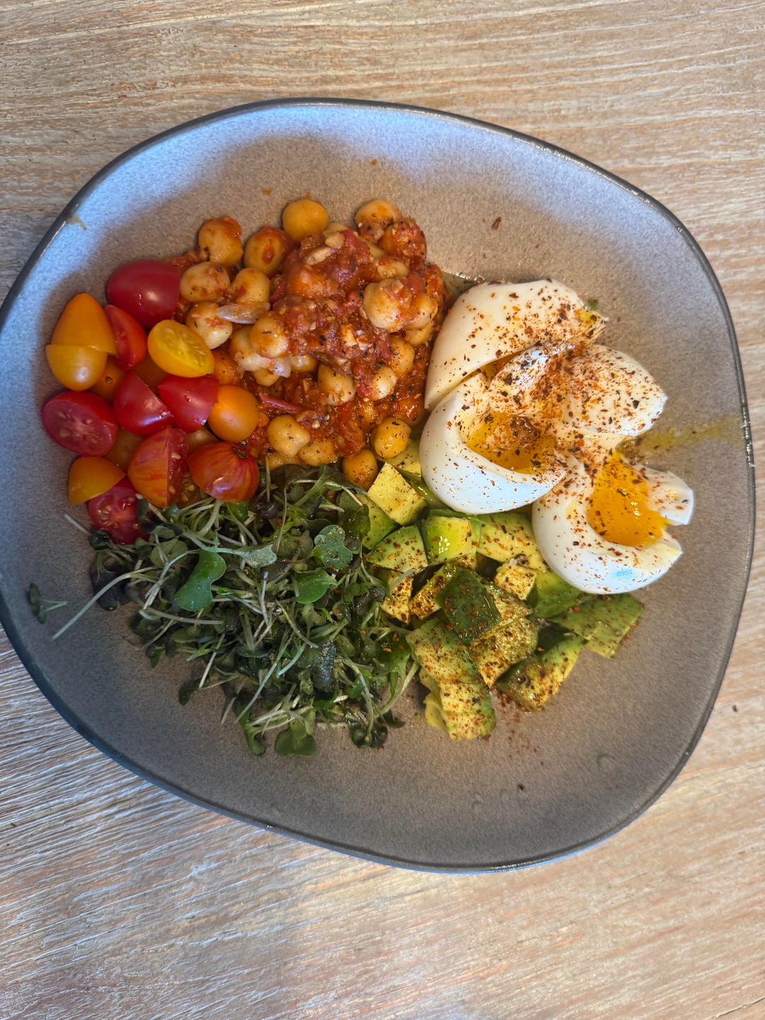 Breakfast: soft boiled eggs (I am so challenged with boiled eggs – each brand cooks in a different time, I was shooting for medium), microgreens, avocado, chickpeas with muhummara leftover sauce