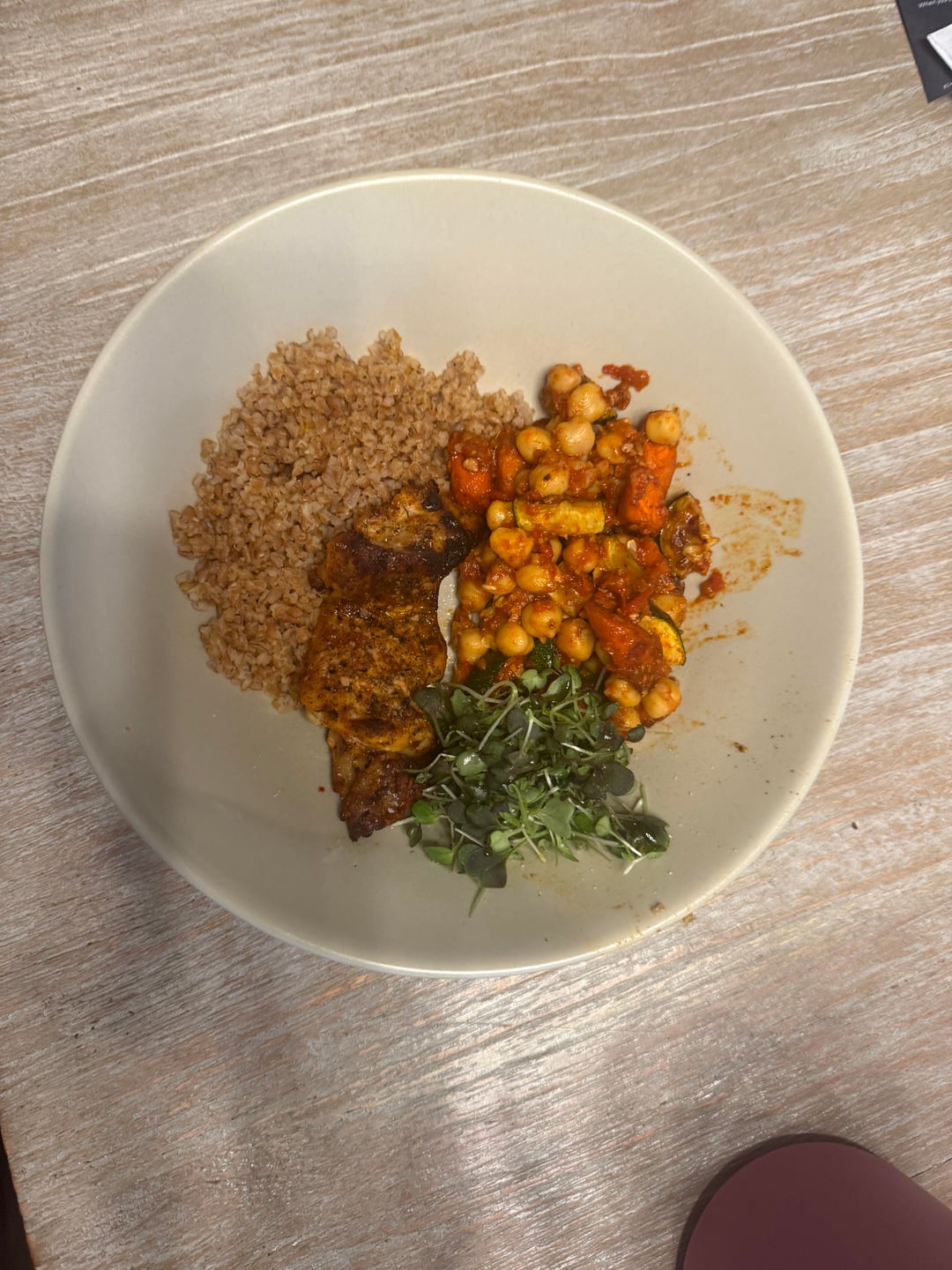 Dinner: leftover baharat chicken, saffron bukgur, microgreens, chickpeas with roasted zucchini and carrots topped with muhummara.