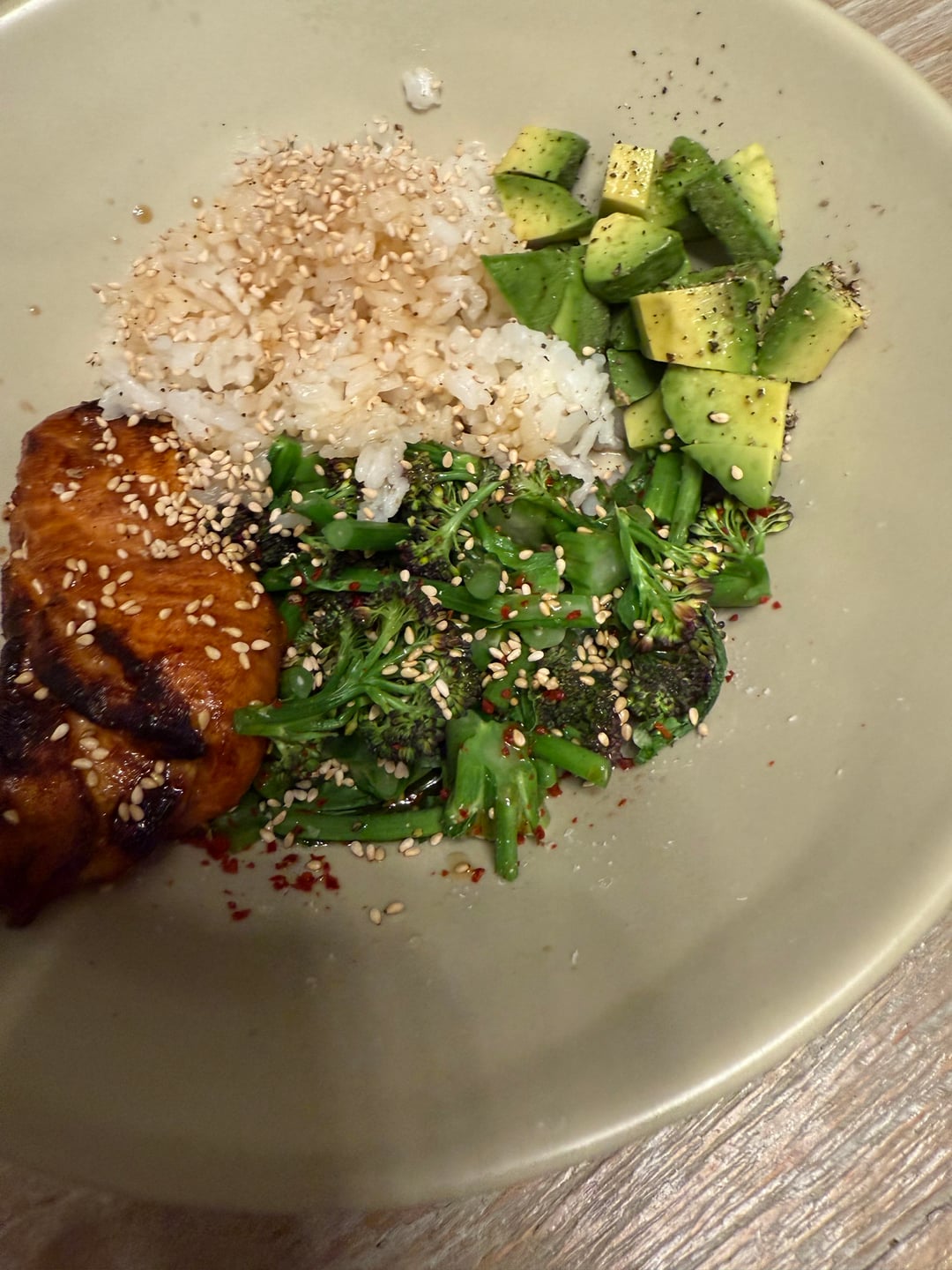 Dinner: broiled miso/soy/ginger salmon, rice, steamed broccoli, avocado