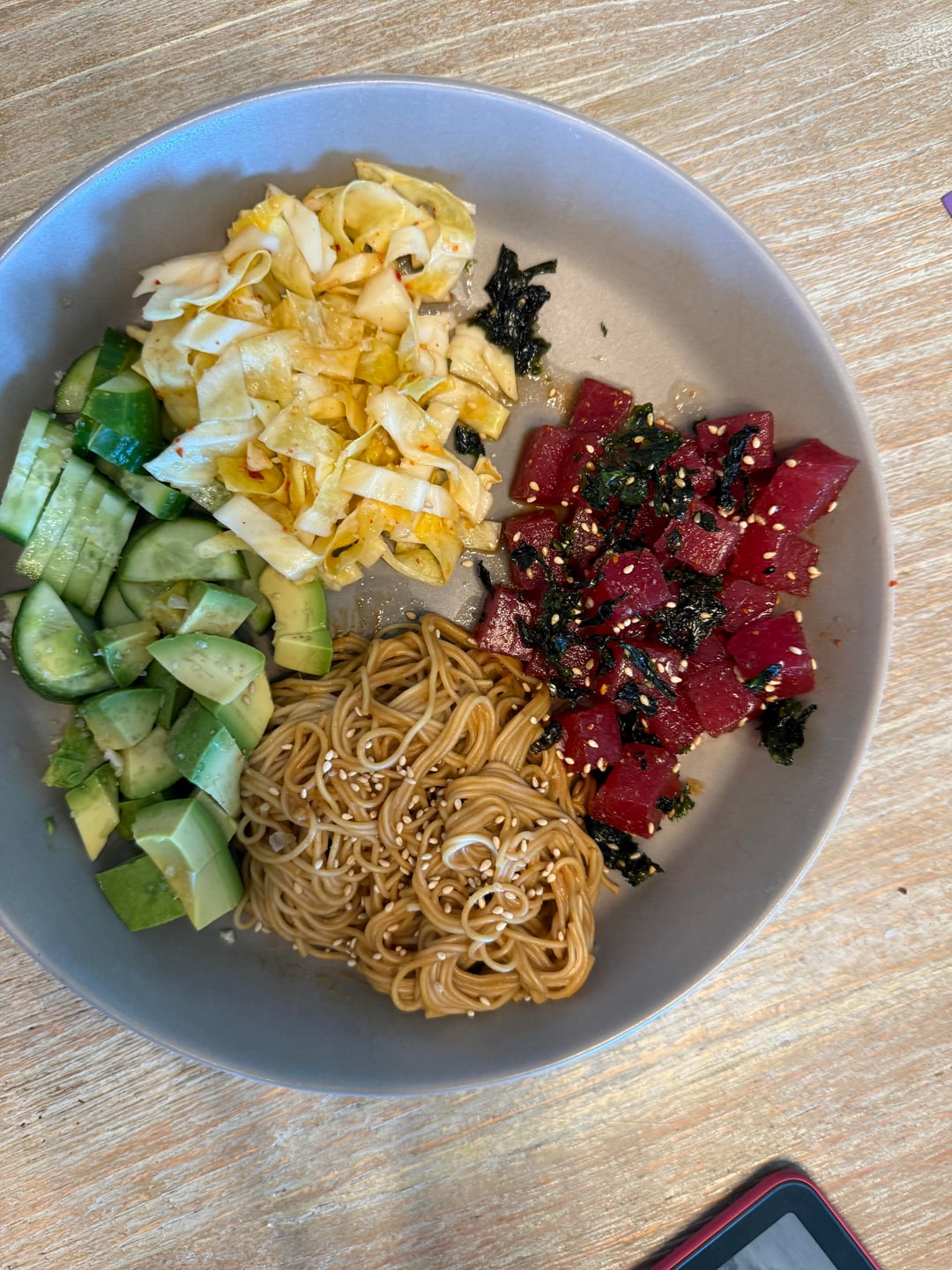 Lunch: tuna poke, a cabbage slaw, tahini/miso/soy somen noodles, cucumber, avocado