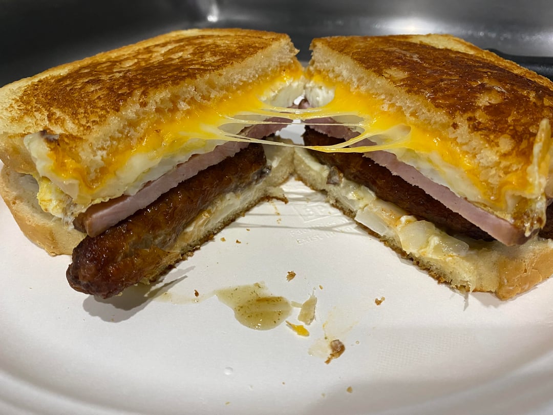 pepper jack, cheddar, two eggs over medium, ham, and sausage links, also mayo and red & green tobascoby thankyoubutimokay Dining and Cooking